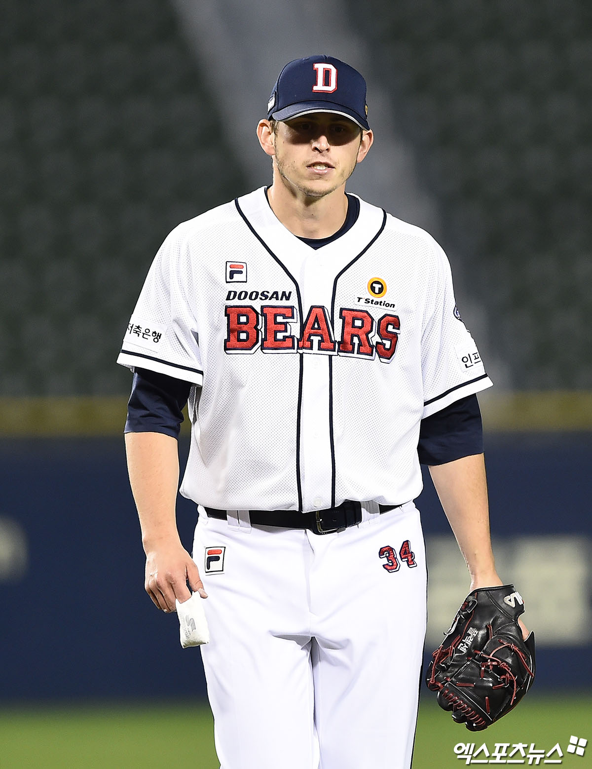 [엑스포츠뉴스 잠실, 박지영 기자] 14일 오후 서울 송파구 잠실야구장에서 열린 '2020 신한은행 SOL KBO리그' 한화 이글스와 두산 베어스의 경기, 2회초 종료 후 두산 플렉센이 더그아웃으로 향하고 있다.