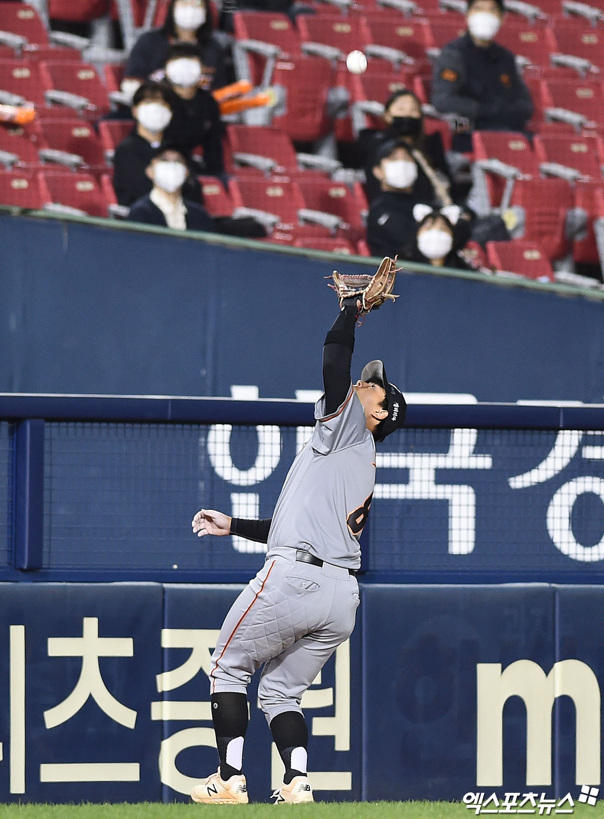 [엑스포츠뉴스 잠실, 박지영 기자] 14일 오후 서울 송파구 잠실야구장에서 열린 '2020 신한은행 SOL KBO리그' 한화 이글스와 두산 베어스의 경기, 8회말 무사 한화 3루수 노시환이 두산 선두타자 최주환의 파울 타구를 잡아내고 있다.
