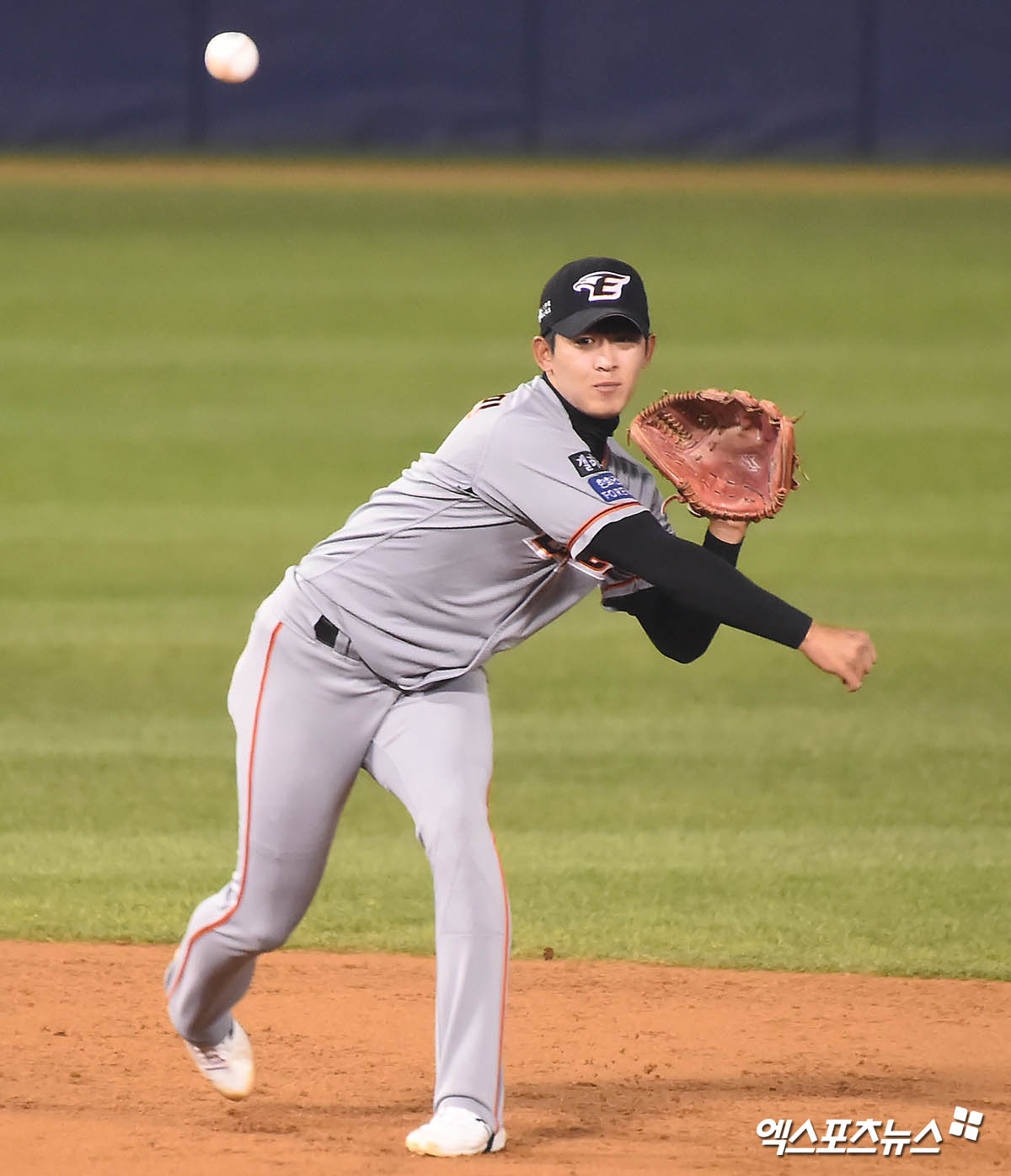 [엑스포츠뉴스 잠실, 윤다희 기자] 27일 오후 서울 송파구 잠실야구장에서 열린 ‘2020 신한은행 SOL KBO 리그’ 한화 이글스와 두산 베어스의 경기, 2회말 1사 2루 한화 조한민이 두산 김재호의 타구를 잡아 1루로 송구하고 있다.