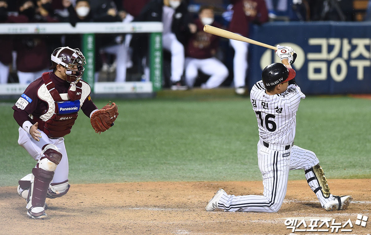 [엑스포츠뉴스 잠실, 박지영 기자] 2일 오후 서울 송파구 잠실야구장에서 열린 '2020 신한은행 SOL KBO 포스트시즌' 키움 히어로즈와 LG 트윈스의 와일드카드 1차전 경기, 연장10회말 2사 1,3루 LG 김민성이 헛스윙 삼진 아웃으로 물러나고 있다.