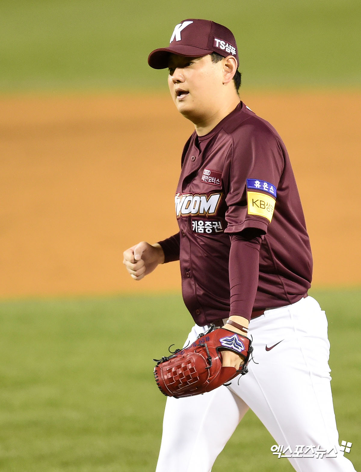 [엑스포츠뉴스 잠실, 김한준 기자] 2일 오후 서울 송파구 잠실야구장에서 열린 ‘2020 신한은행 SOL 포스트시즌’ 키움 히어로즈와 LG 트윈스의 와일드카드 1차전 경기, 연장 10회말 2사 1,3루 키움 양현이 LG 김민성을 헛스윙 삼진으로 처리한 후 더그아웃으로 향하고 있다.