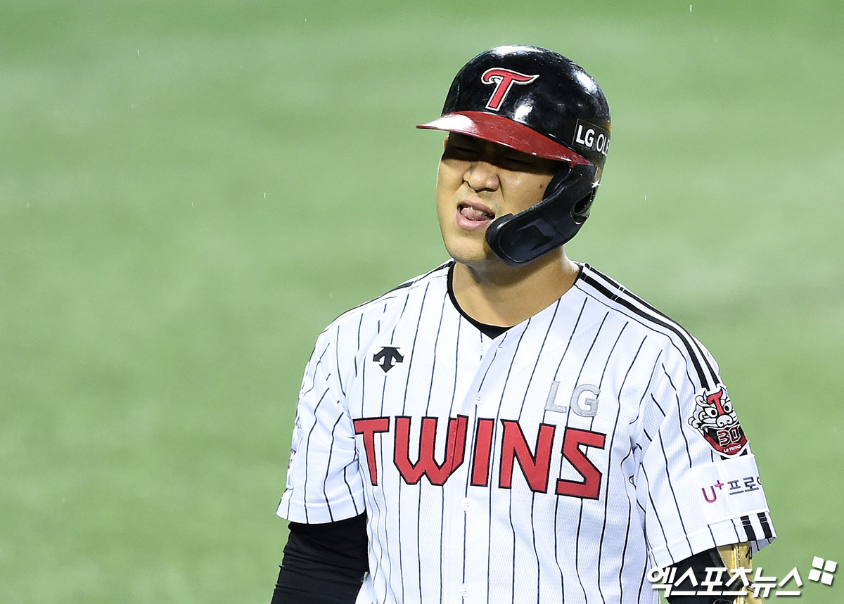[엑스포츠뉴스 잠실, 박지영 기자] 2일 오후 서울 송파구 잠실야구장에서 열린 '2020 신한은행 SOL KBO 포스트시즌' 키움 히어로즈와 LG 트윈스의 와일드카드 1차전 경기, 연장10회말 2사 1,3루 LG 김민성이 헛스윙 삼진 아웃으로 물러나며 아쉬워하고 있다.