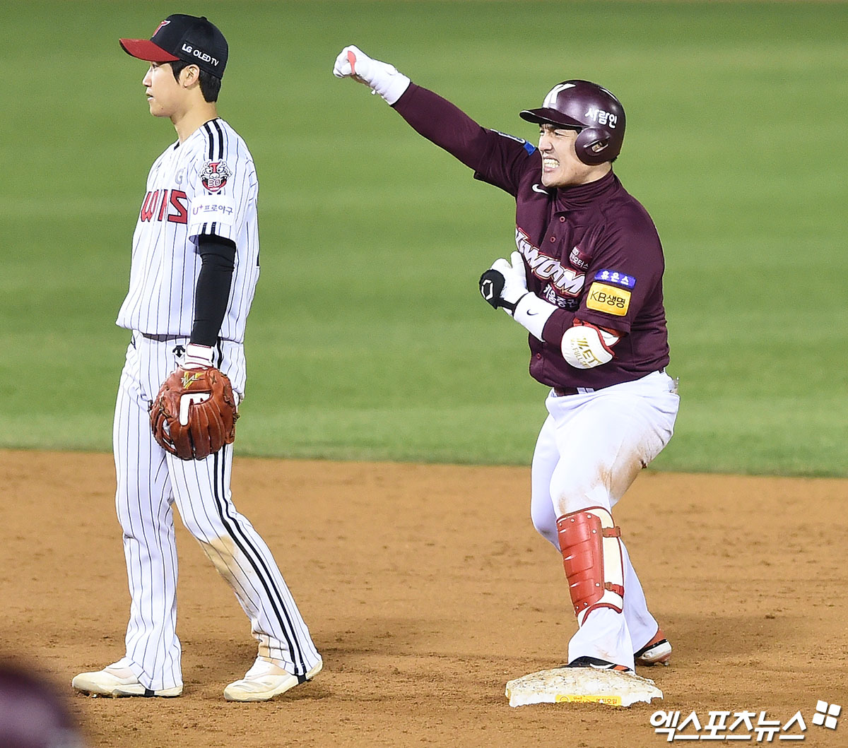 [엑스포츠뉴스 잠실, 박지영 기자] 2일 오후 서울 송파구 잠실야구장에서 열린 '2020 신한은행 SOL KBO 포스트시즌' 키움 히어로즈와 LG 트윈스의 와일드카드 1차전 경기, 연장13회초 2사 1,2루 키움 박동원이 1타점 적시 2루타를 때려낸 뒤 환호하고 있다.