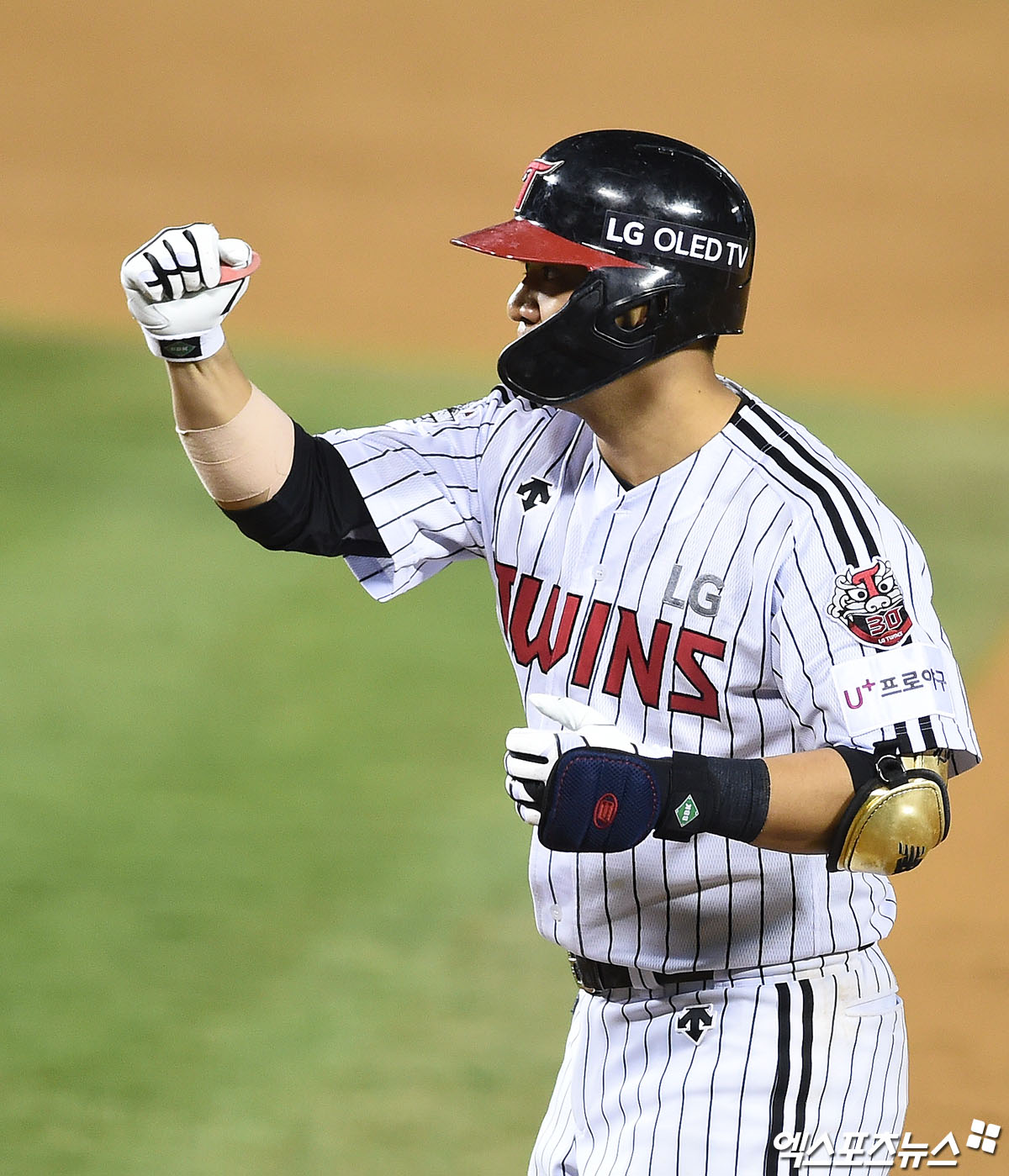 [엑스포츠뉴스 잠실, 박지영 기자] 2일 오후 서울 송파구 잠실야구장에서 열린 '2020 신한은행 SOL KBO 포스트시즌' 키움 히어로즈와 LG 트윈스의 와일드카드 1차전 경기, 연장13회말 1사 1루 LG 김민성이 안타를 때려낸 뒤 환호하고 있다.