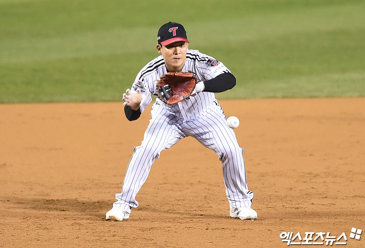 [엑스포츠뉴스 잠실, 박지영 기자] 5일 오후 서울 송파구 잠실야구장에서 열린 '2020 신한은행 SOL KBO 포스트시즌' 두산 베어스와 LG 트윈스의 준플레이오프 2차전 경기, 4회초 무사 1루 LG 3루수 김민성이 두산 허경민의 땅볼 타구를 수비하고 있다.