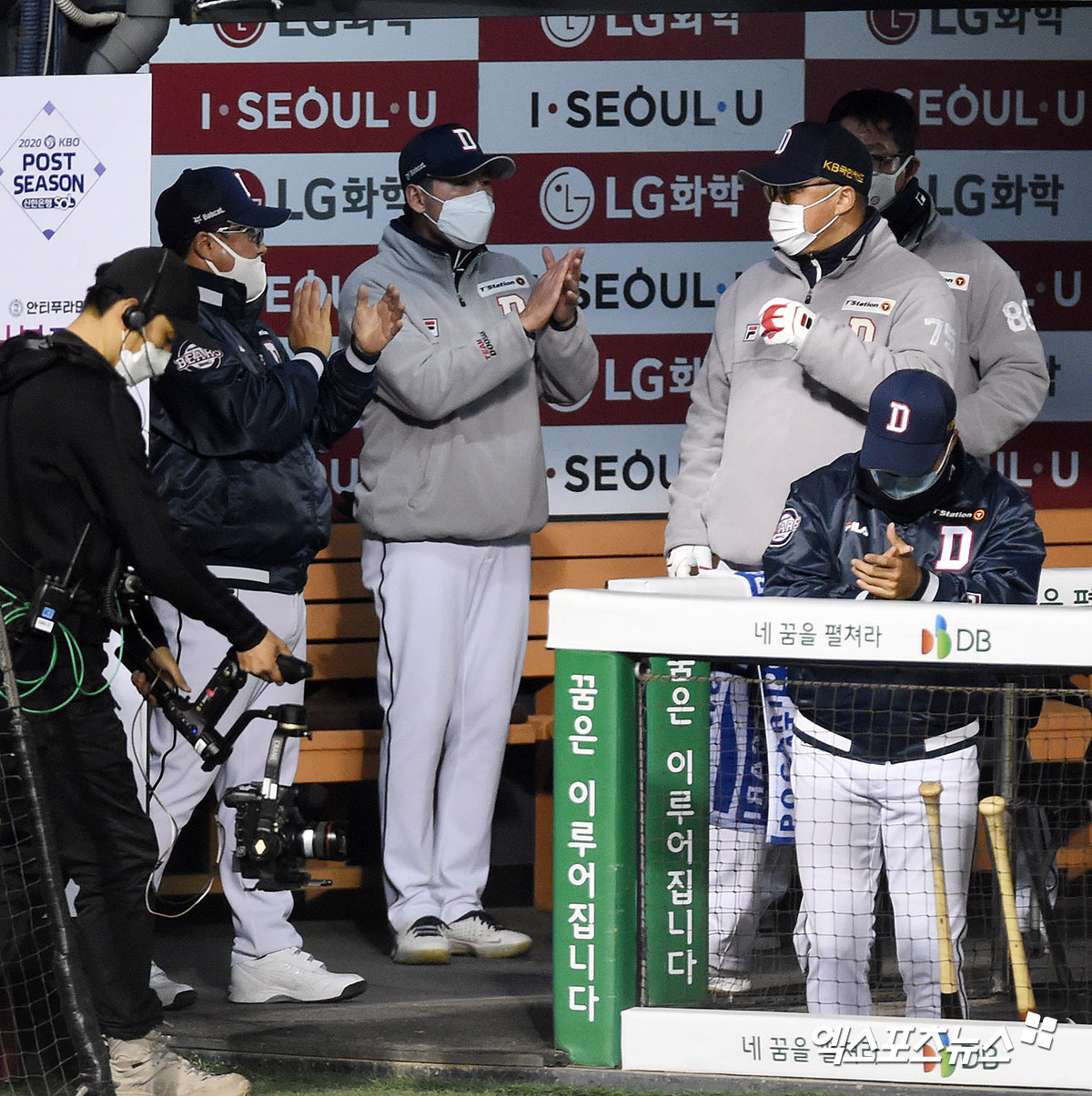 [엑스포츠뉴스 잠실, 김한준 기자] 5일 오후 서울 송파구 잠실야구장에서 열린 ‘2020 신한은행 SOL 포스트시즌’ 두산 베어스와 LG 트윈스의 준플레이오프 2차전 경기, 두산 베어스와 LG 트윈스의 준플레이오프 2차전 경기, 두산이 타격전 끝에 LG에게 9:7의 스코어로 승리하며 플레이오프 진출을 확정했다.