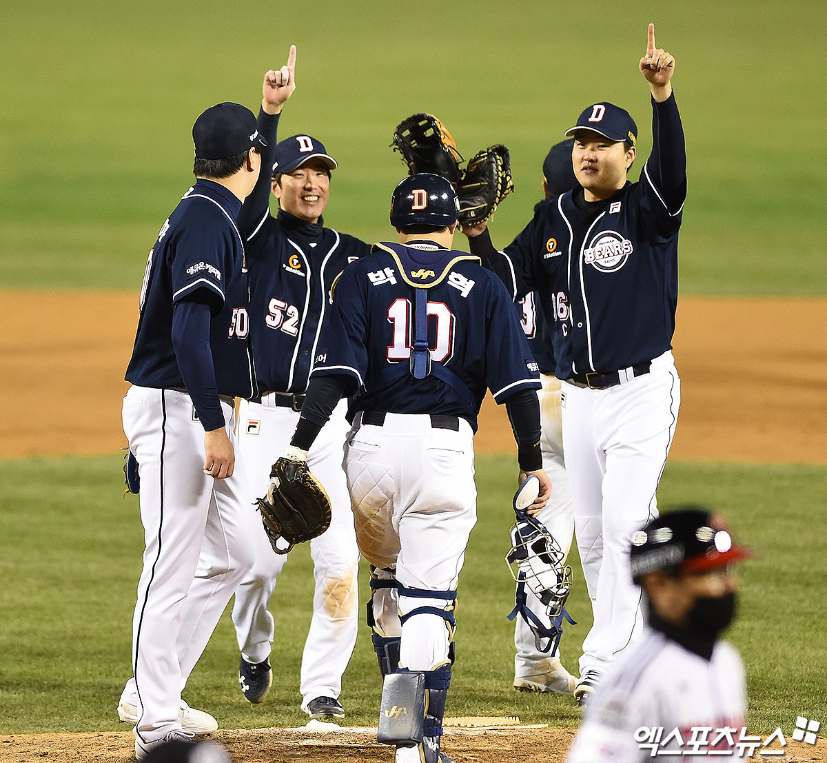 경기 종료 후 두산 선수들이 승리의 기쁨을 나누고 있다.