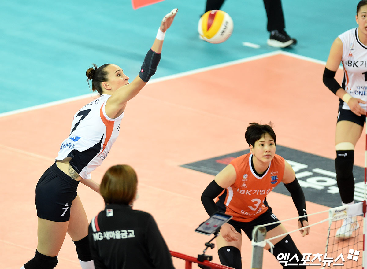 [엑스포츠뉴스 인천, 김한준 기자] 7일 오후 인천 계양체육관에서 열린 ‘2020-2021 도드람 V리그’ 흥국생명과 기업은행의 경기, 기업은행 라자레바가 공격을 시도하고 있다.