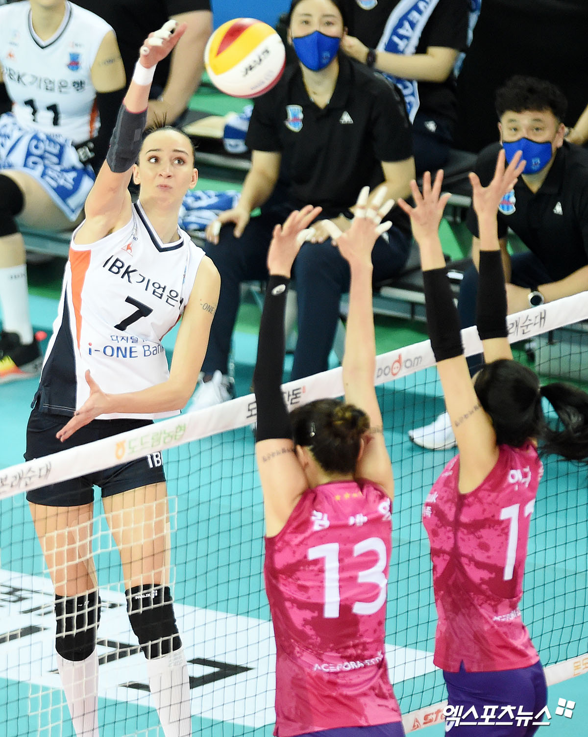 [엑스포츠뉴스 인천, 김한준 기자] 7일 오후 인천 계양체육관에서 열린 ‘2020-2021 도드람 V리그’ 흥국생명과 기업은행의 경기, 기업은행 라자레바가 공격을 시도하고 있다.