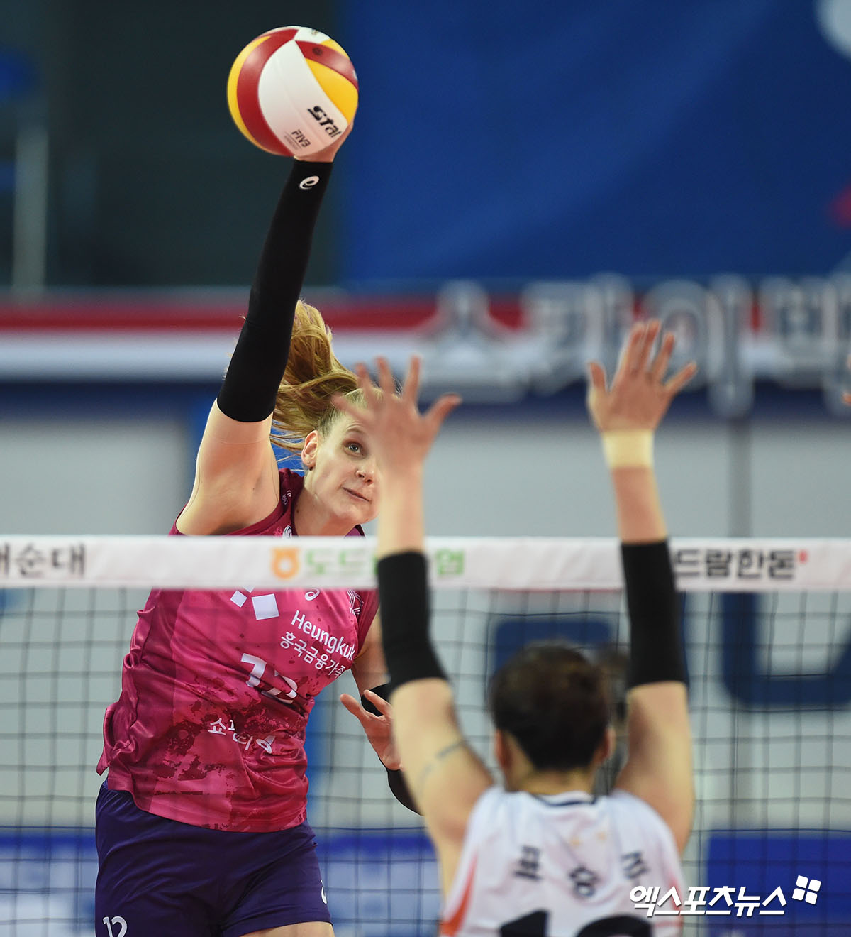 [엑스포츠뉴스 인천, 김한준 기자] 7일 오후 인천 계양체육관에서 열린 ‘2020-2021 도드람 V리그’ 흥국생명과 기업은행의 경기, 흥국생명 루시아가 공격을 시도하고 있다.