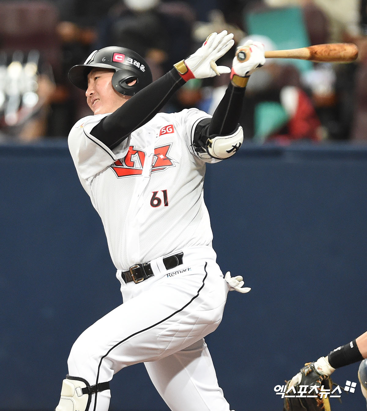 [엑스포츠뉴스 고척, 김한준 기자] 9일 오후 서울 구로구 고척스카이돔에서 열린 ‘2020 신한은행 SOL 포스트시즌’ 두산 베어스와 KT 위즈의 플레이오프 1차전 경기, 8회말 2사 만루 KT 유한준이 2타점 적시타를 날리고 있다.