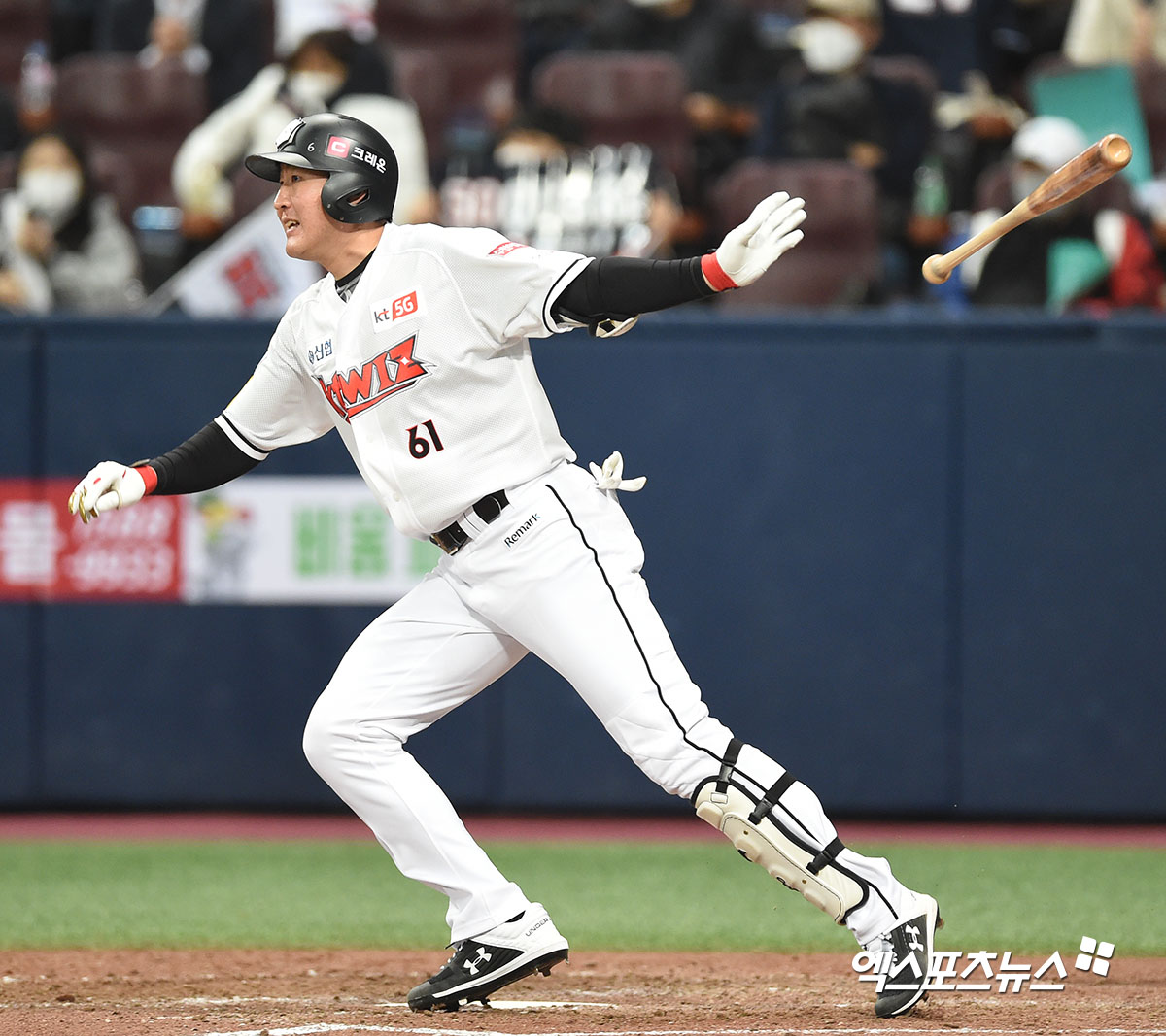 [엑스포츠뉴스 고척, 김한준 기자] 9일 오후 서울 구로구 고척스카이돔에서 열린 ‘2020 신한은행 SOL 포스트시즌’ 두산 베어스와 KT 위즈의 플레이오프 1차전 경기, 8회말 2사 만루 KT 유한준이 2타점 적시타를 날리고 있다.