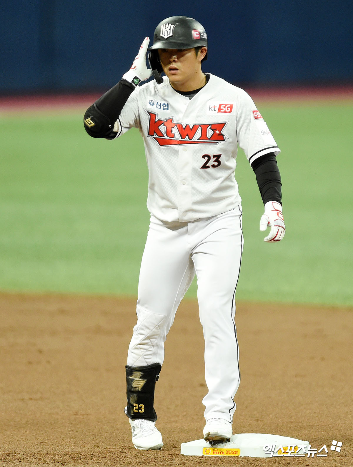 [엑스포츠뉴스 고척, 김한준 기자] 10일 오후 서울 구로구 고척스카이돔에서 열린 ‘2020 신한은행 SOL 포스트시즌’ 두산 베어스와 KT 위즈의 플레이오프 2차전 경기, 1회말 KT 조용호가 2루타를 날린 후 세리머니를 하고 있다.