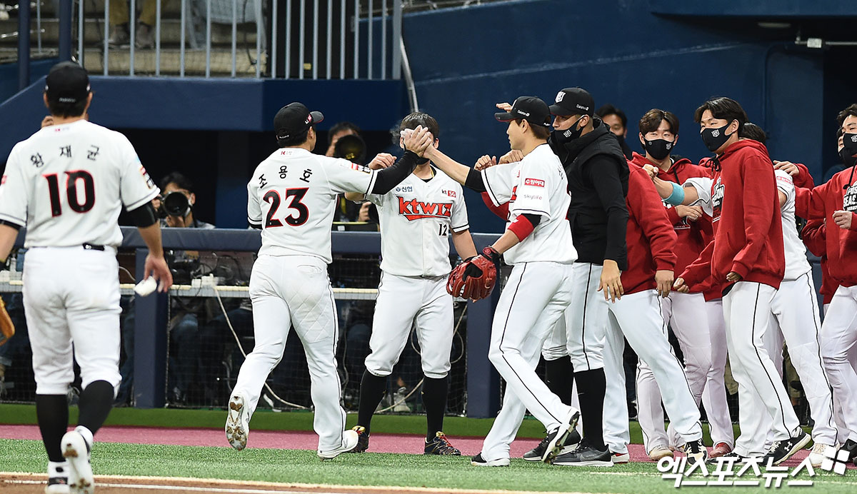 [엑스포츠뉴스 고척, 박지영 기자] 10일 오후 서울 구로구 고척스카이돔에서 열린 '2020 신한은행 SOL KBO 포스트시즌' 두산 베어스와 KT 위즈의 플레이오프 2차전 경기, 2회초 종료 후 KT 조용호가 더그아웃으로 향하며 동료들의 격려를 받고 있다.