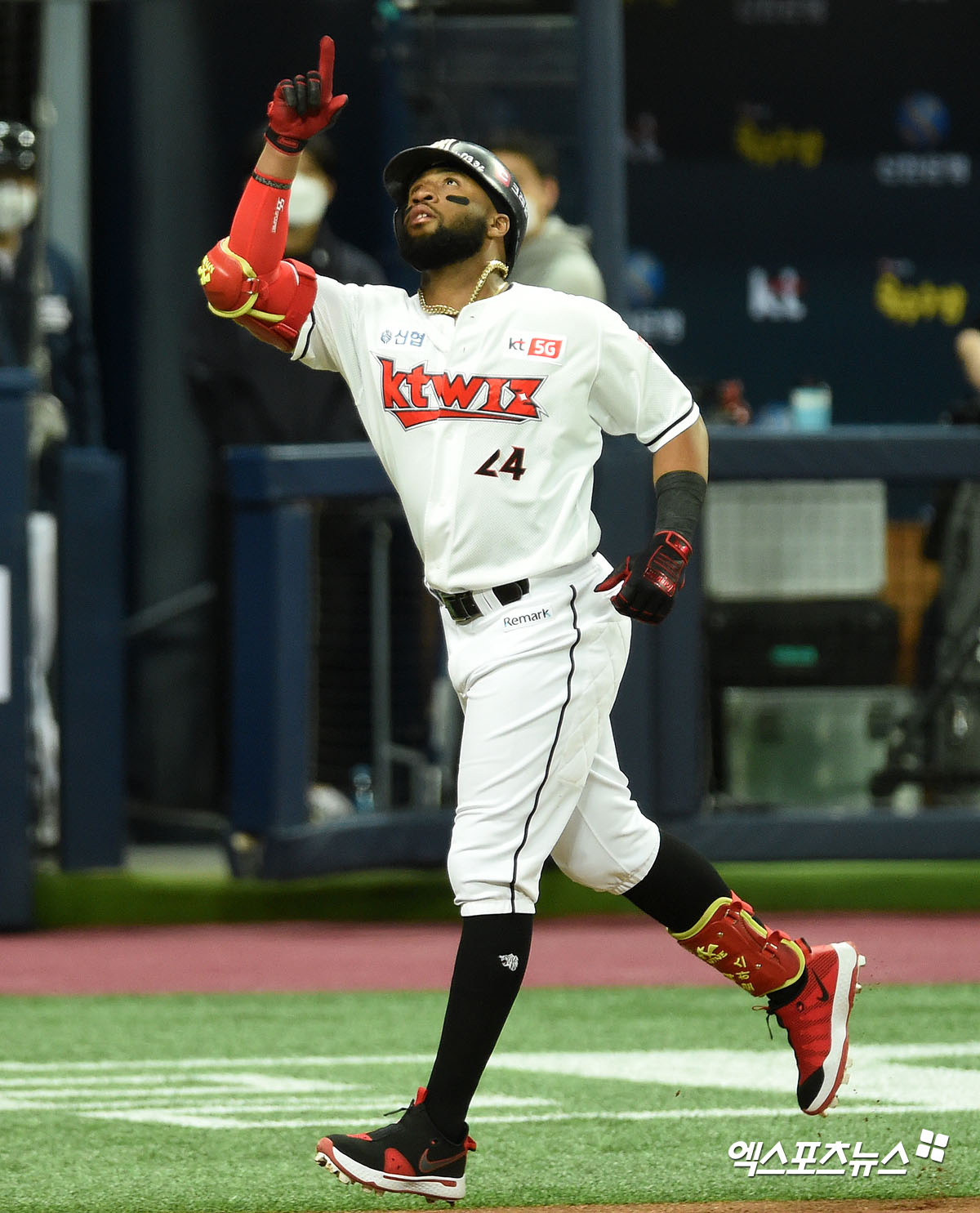 [엑스포츠뉴스 고척, 김한준 기자] 10일 오후 서울 구로구 고척스카이돔에서 열린 ‘2020 신한은행 SOL 포스트시즌’ 두산 베어스와 KT 위즈의 플레이오프 2차전 경기, 3회말 2사 KT 로하스가 솔로 홈런을 날린 후 세리머니를 하고 있다.