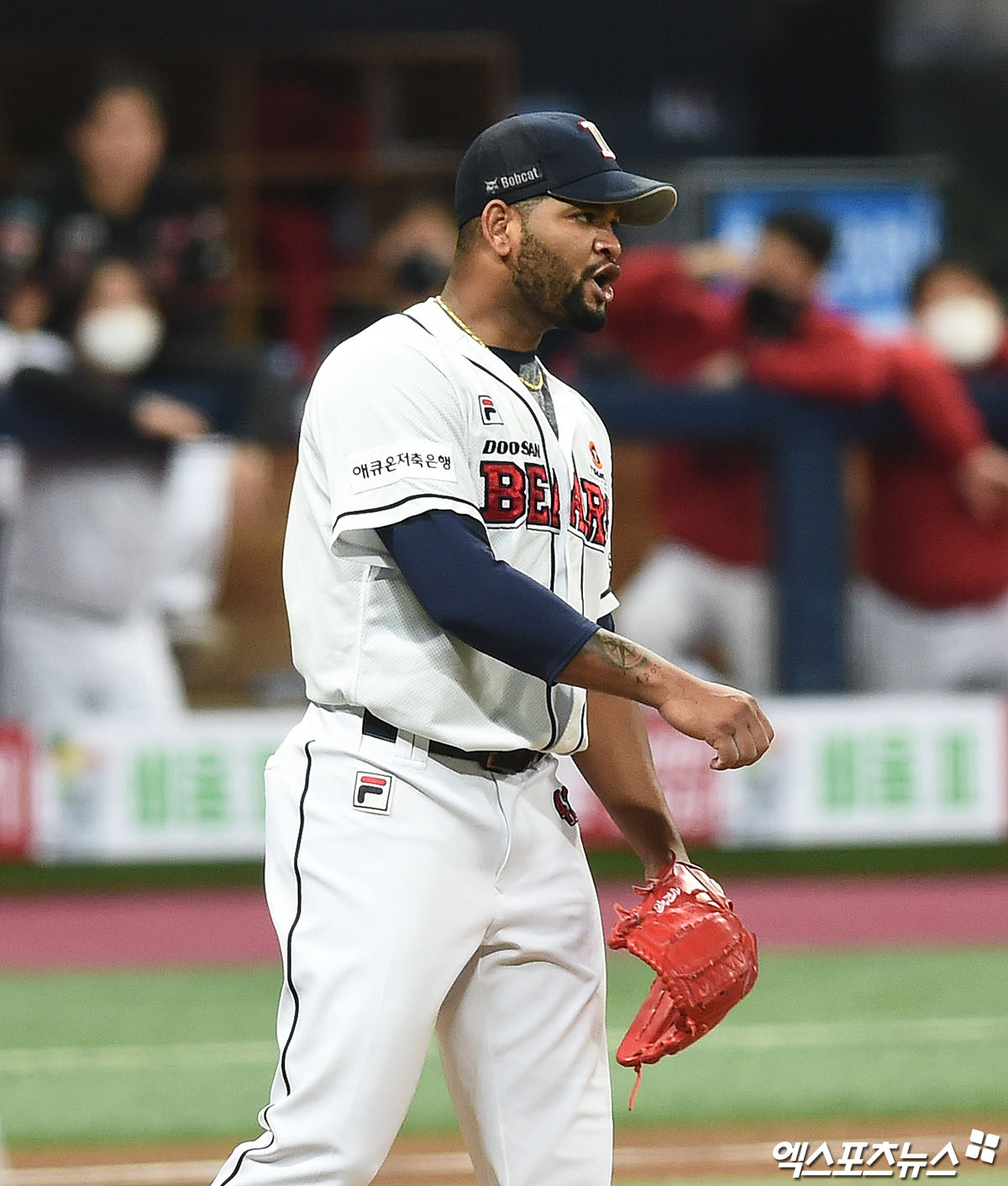 [엑스포츠뉴스 고척, 박지영 기자] 12일 오후 서울 구로구 고척스카이돔에서 열린 '2020 신한은행 SOL KBO 포스트시즌' KT 위즈와 두산 베어스의 경기, 7회초 종료 후 두산 선발투수 알칸타라가 환호하고 있다.