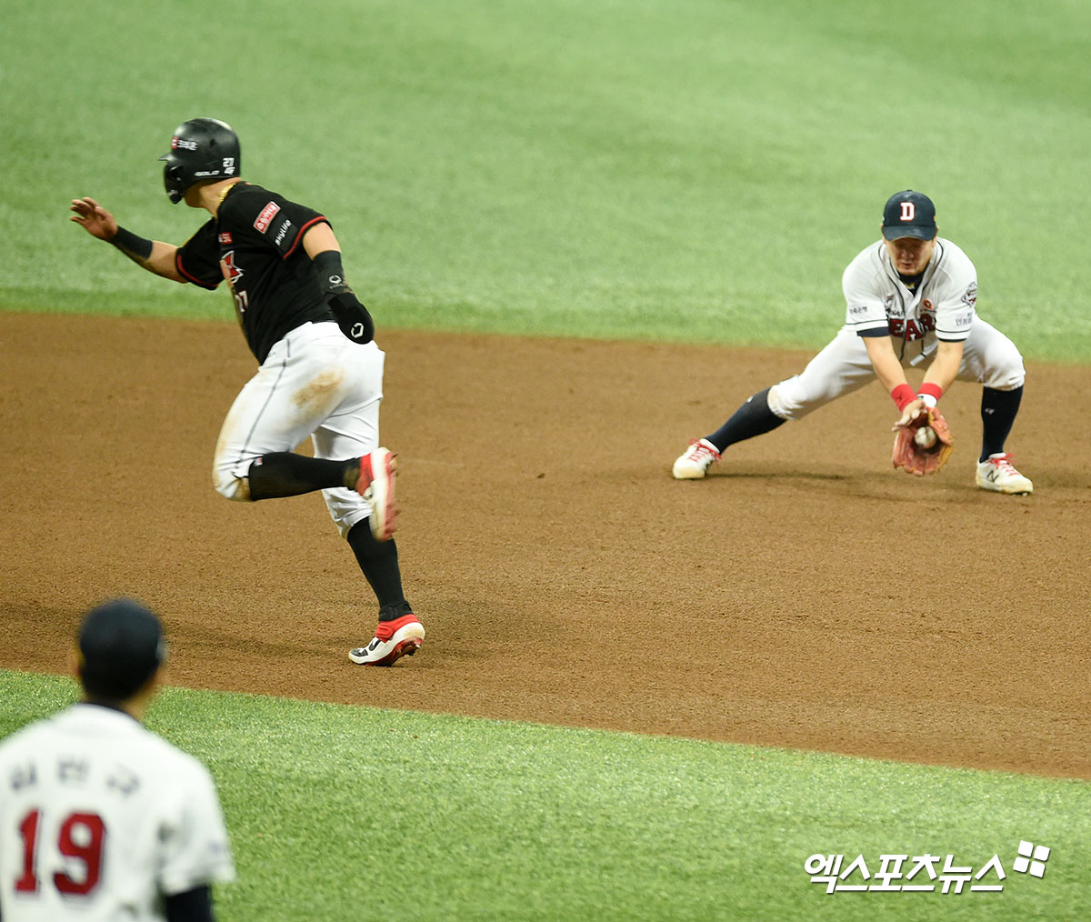 [엑스포츠뉴스 고척, 김한준 기자] 13일 오후 서울 구로구 고척스카이돔에서 열린 ‘2020 신한은행 SOL 포스트시즌’ KT 위즈와 두산 베어스의 플레이오프 4차전 경기, 5회초 1사 1루 두산 최주환이 KT 심우준의 내야땅볼을 포구하고 있다.