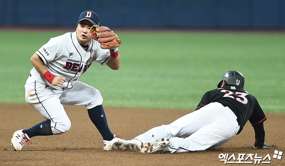 [엑스포츠뉴스 고척, 박지영 기자] 13일 오후 서울 구로구 고척스카이돔에서 열린 '2020 신한은행 SOL KBO 포스트시즌' KT 위즈와 두산 베어스의 플레이오프 4차전 경기, 6회초 2사 1루 KT 유한준 타석 때 1루주자 조용호가 2루 도루를 시도했으나 두산 2루수 최주환에게 태그아웃 당하고 있다.
