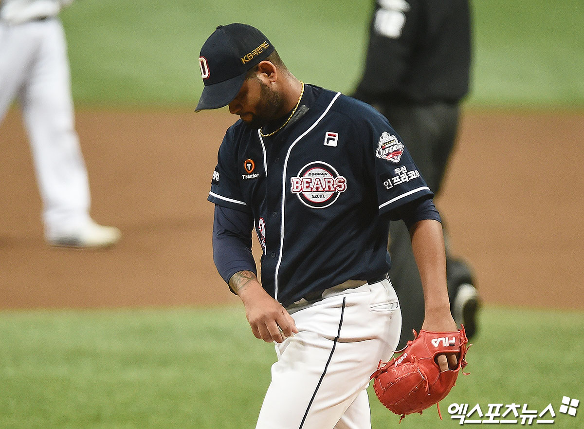 [엑스포츠뉴스 고척, 박지영 기자] 17일 오후 서울 구로구 고척스카이돔에서 열린 '2020 신한은행 SOL KBO 포스트시즌' 두산 베어스와 NC 다이노스의 한국시리즈 1차전 경기, 1회말 종료 후 두산 선발투수 알칸타라가 더그아웃으로 향하고 있다.