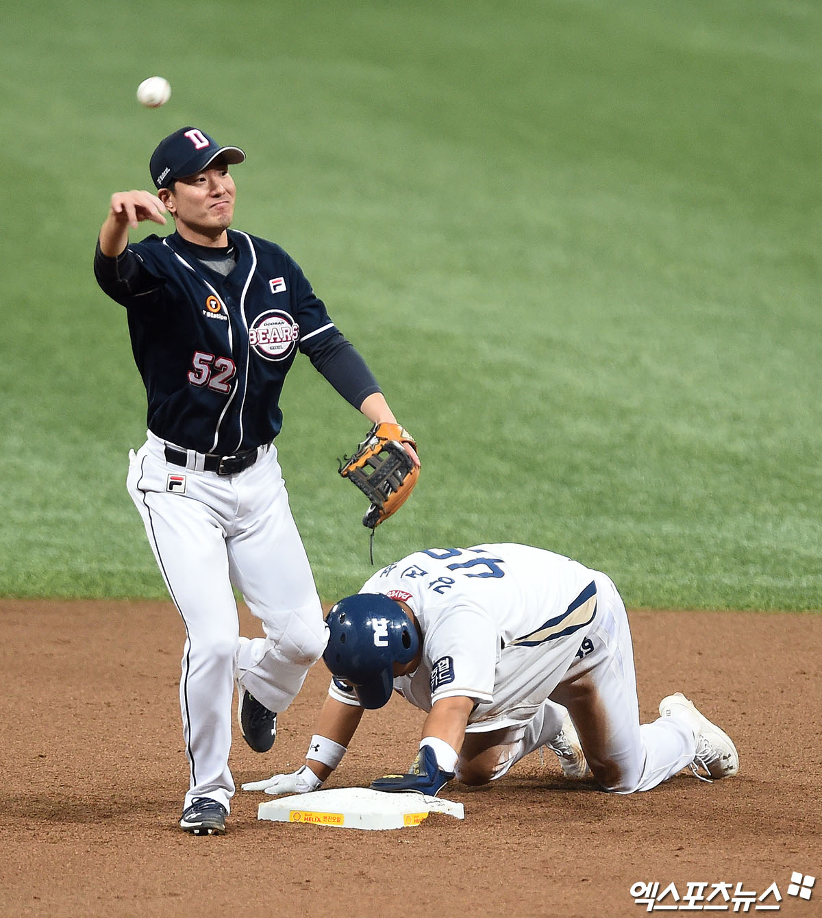 [엑스포츠뉴스 고척, 박지영 기자] 17일 오후 서울 구로구 고척스카이돔에서 열린 '2020 신한은행 SOL KBO 포스트시즌' 두산 베어스와 NC 다이노스의 한국시리즈 1차전 경기, 2회말 2사 1루 NC 박민우 타석 때 1루주자 강진성이 2루 도루를 시도했으나 두산 유격수 김재호에게 태그아웃 당하고 있다. 이후 NC측 요청으로 비디오 판독 실시했으나 원심 유지.
