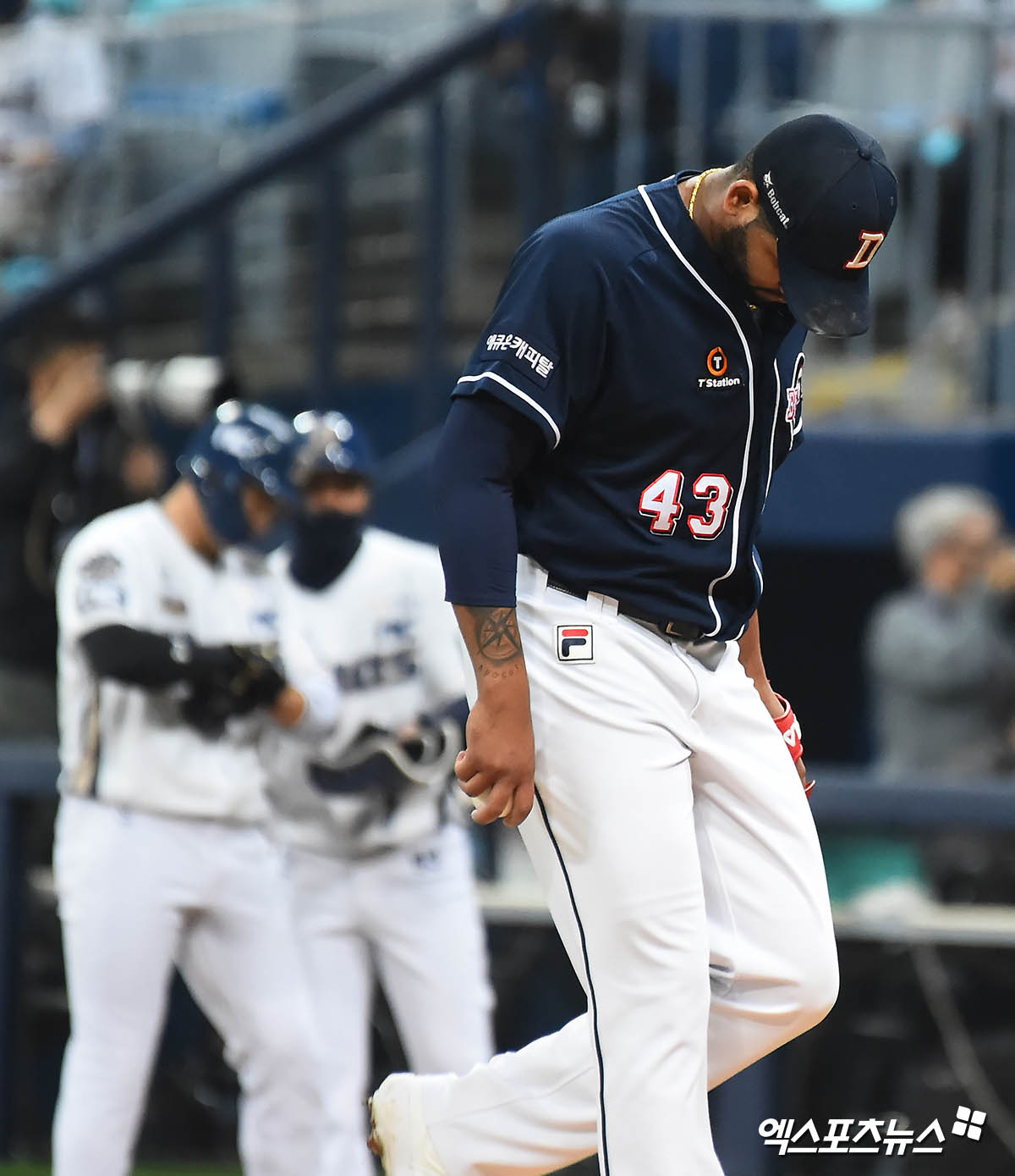 ​​[엑스포츠뉴스 고척, 윤다희 기자] 17일 오후 서울 구로구 고척스카이돔에서 열린 ‘2020 신한은행 SOL KBO 리그’ 두산 베어스와 NC 다이노스의 한국시리즈 1차전 경기, 1회말 1사 3루 NC 나성범에게 1타점 적시타를 내준 두산 알칸타라가 아쉬워하고 있다.