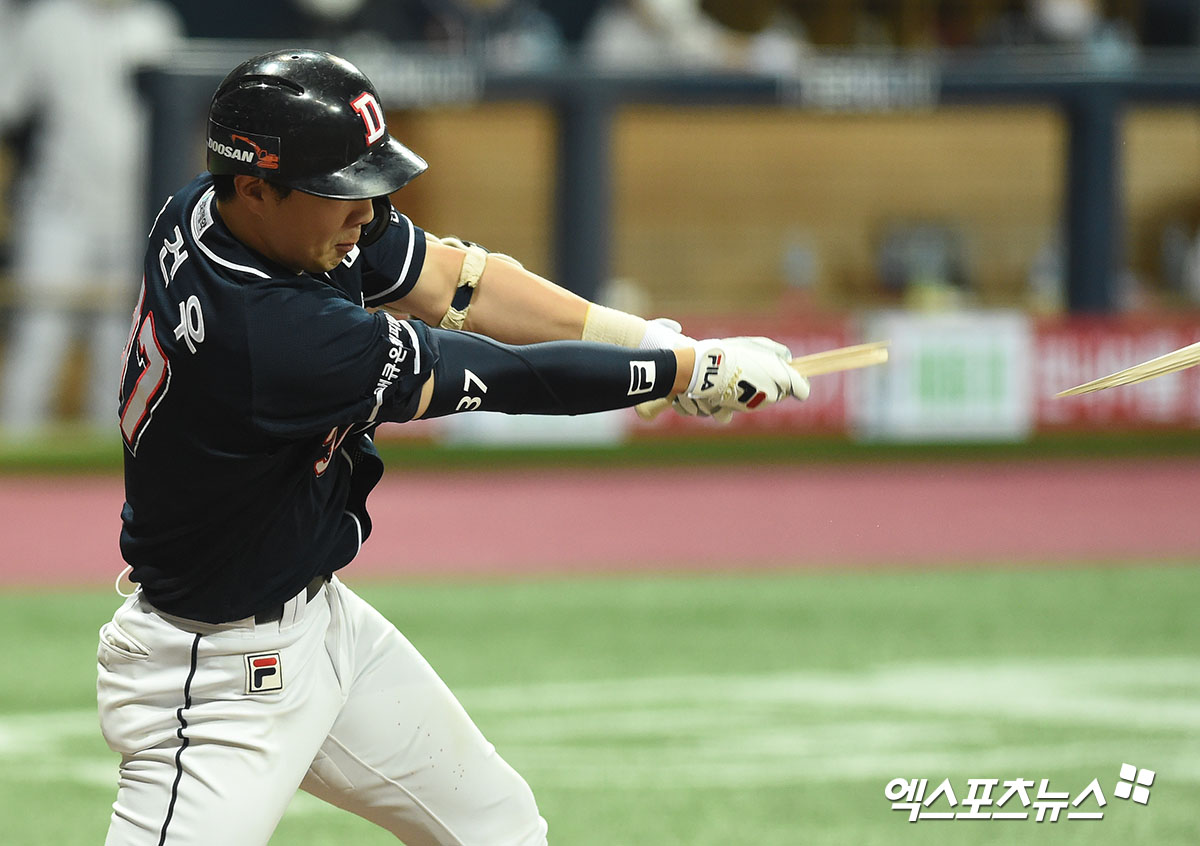 [엑스포츠뉴스 고척, 김한준 기자] 17일 오후 서울 구로구 고척스카이돔에서 열린 ‘2020 신한은행 SOL 포스트시즌’ 두산 베어스와 NC 다이노스의 한국시리즈 1차전 경기, 7회초 두산 박건우가 타격을 하고 있다. 결과는 유격수 땅볼 아웃.