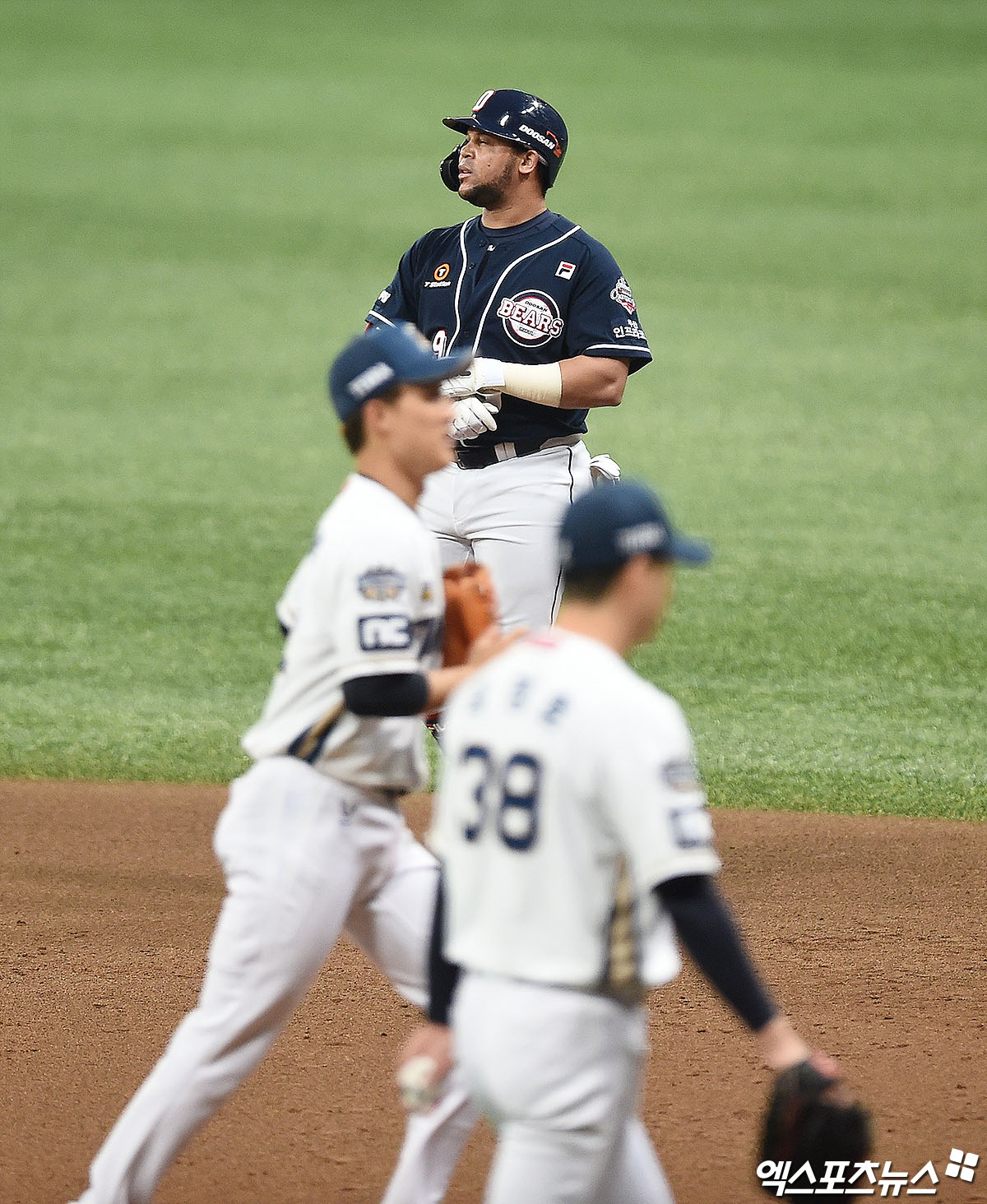 [엑스포츠뉴스 고척, 박지영 기자] 17일 오후 서울 구로구 고척스카이돔에서 열린 '2020 신한은행 SOL KBO 포스트시즌' 두산 베어스와 NC 다이노스의 한국시리즈 1차전 경기, 7회초 1사 1루 두산 페르난데스가 병살타를 때려낸 뒤 아쉬워하고 있다.