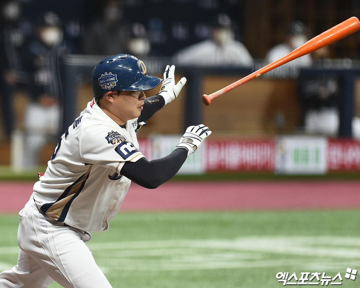 [엑스포츠뉴스 고척, 박지영 기자] 18일 오후 서울 구로구 고척스카이돔에서 열린 '2020 신한은행 SOL KBO 포스트시즌' 두산 베어스와 NC 다이노스의 한국시리즈 2차전 경기, 2회말 1사 1,2루 NC 권희동이 1타점 적시타를 때려내고 있다.