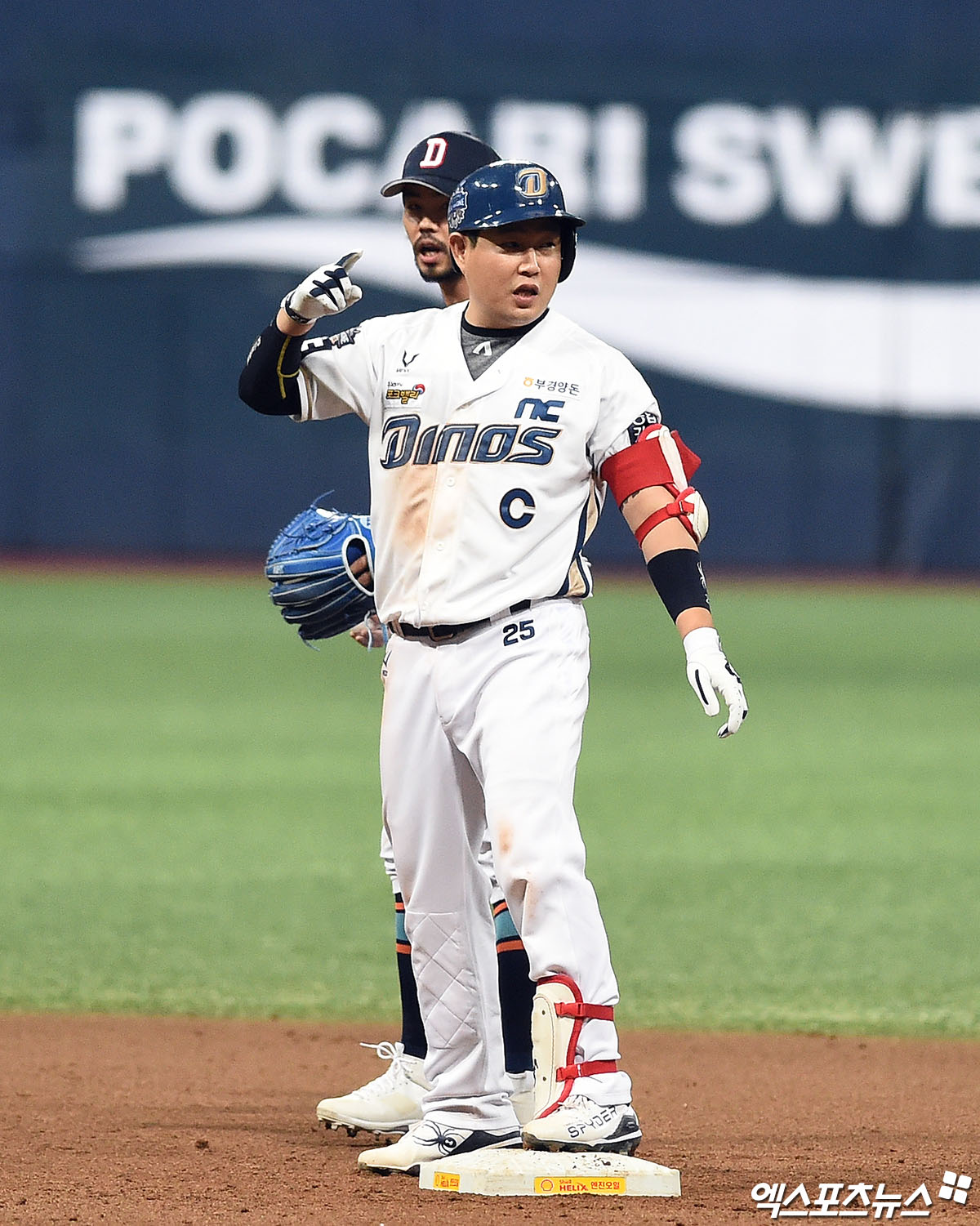 [엑스포츠뉴스 고척, 박지영 기자] 18일 오후 서울 구로구 고척스카이돔에서 열린 '2020 신한은행 SOL KBO 포스트시즌' 두산 베어스와 NC 다이노스의 한국시리즈 2차전 경기, 9회말 무사 NC 선두타자 양의지가 2루타를 때려내고 있다. 이후 NC측 요청으로 홈런성 타구에 대한 비디오 판독 실시했으나 2루타 유지.