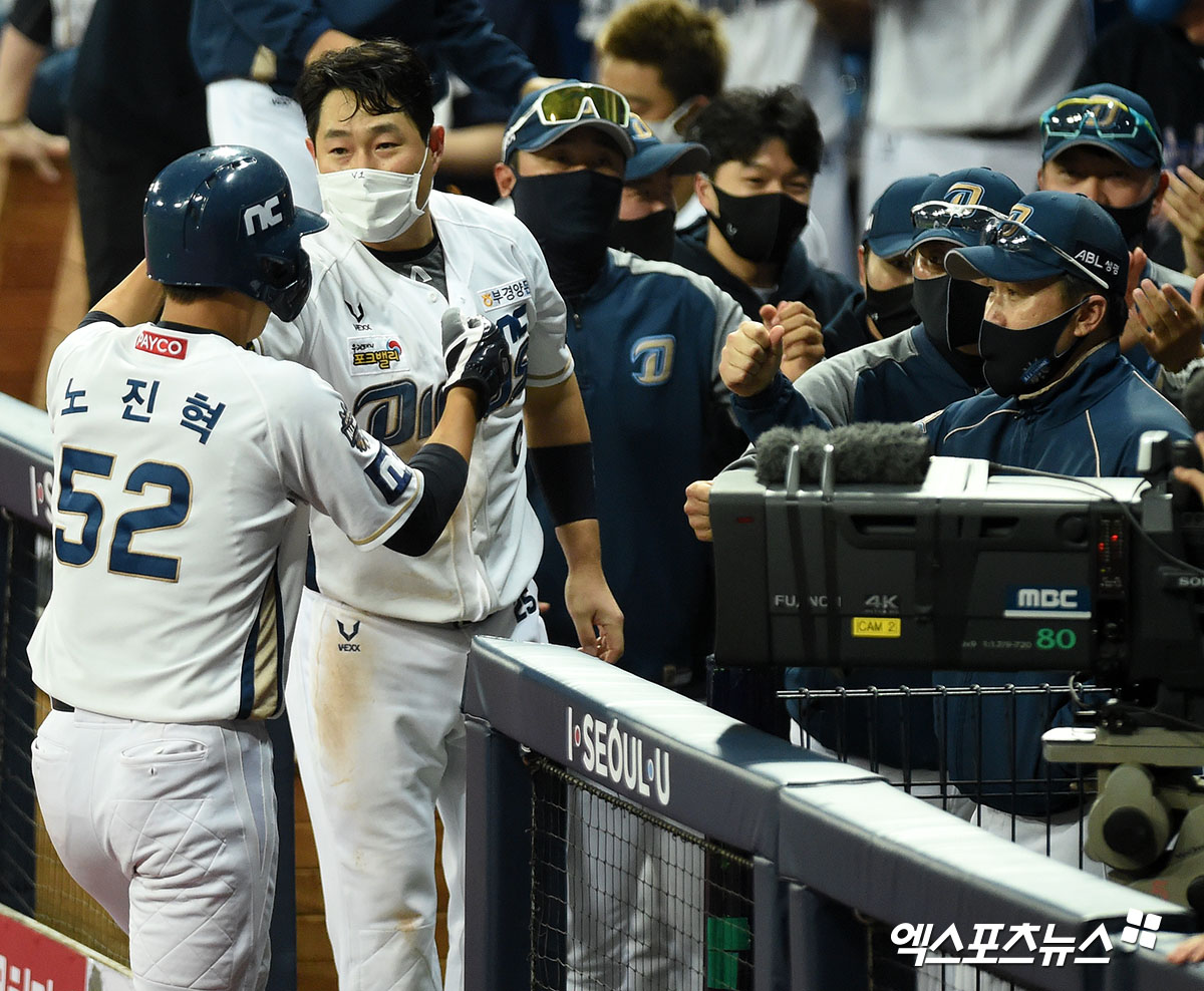 [엑스포츠뉴스 고척, 김한준 기자] 18일 오후 서울 구로구 고척스카이돔에서 열린 ‘2020 신한은행 SOL 포스트시즌’ 두산 베어스와 NC 다이노스의 한국시리즈 2차전 경기, 9회말 1사 만루 NC 노진혁이 강진성의 2타점 적시타때 득점에 성공한 후 더그아웃에서 축하를 받고 있다.