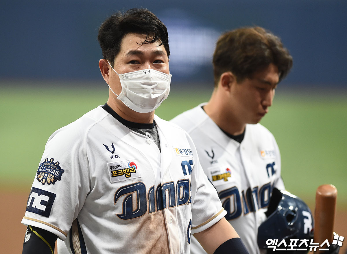 경기 종료 후 NC 양의지와 나성범이 그라운드를 빠져나가고 있다.