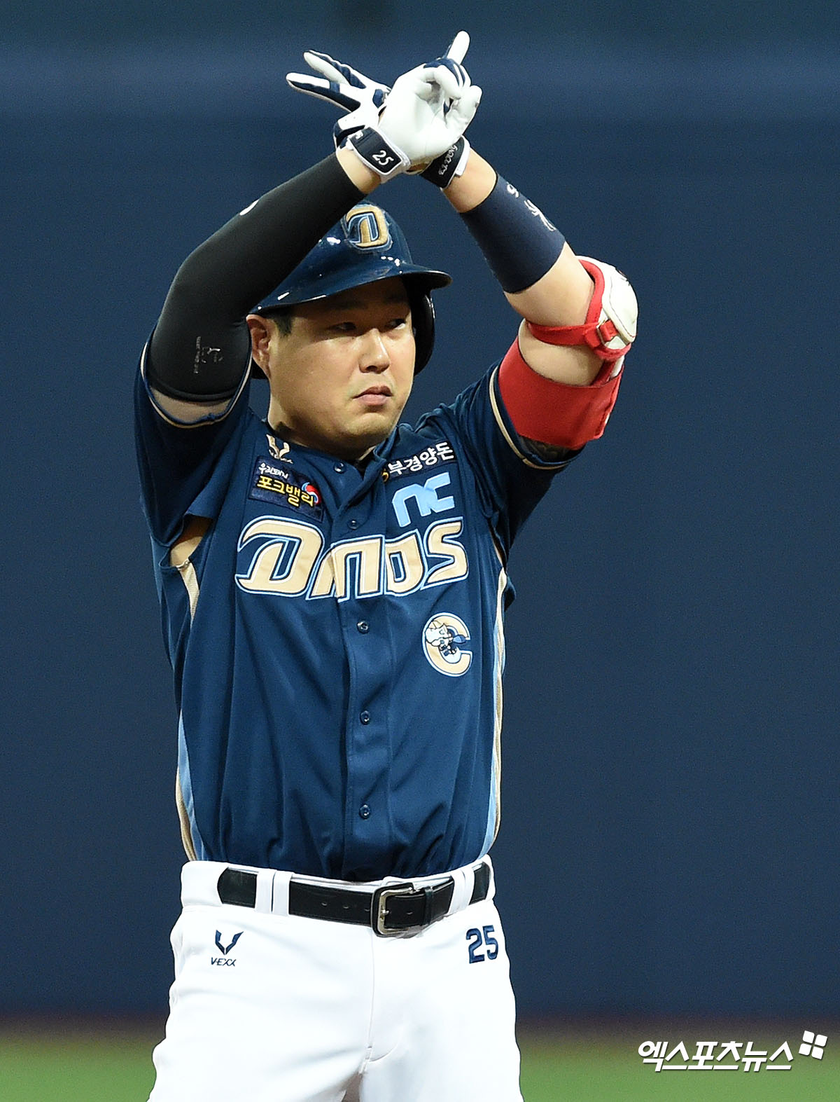 [엑스포츠뉴스 고척, 김한준 기자] 21일 오후 서울 구로구 고척스카이돔에서 열린 ‘2020 신한은행 SOL 포스트시즌’ NC 다이노스와 두산 베어스의 한국시리즈 4차전 경기, 6회초 2사 2루 NC 양의지가 1타점 적시타를 날린 후 세리머니를 하고 있다.