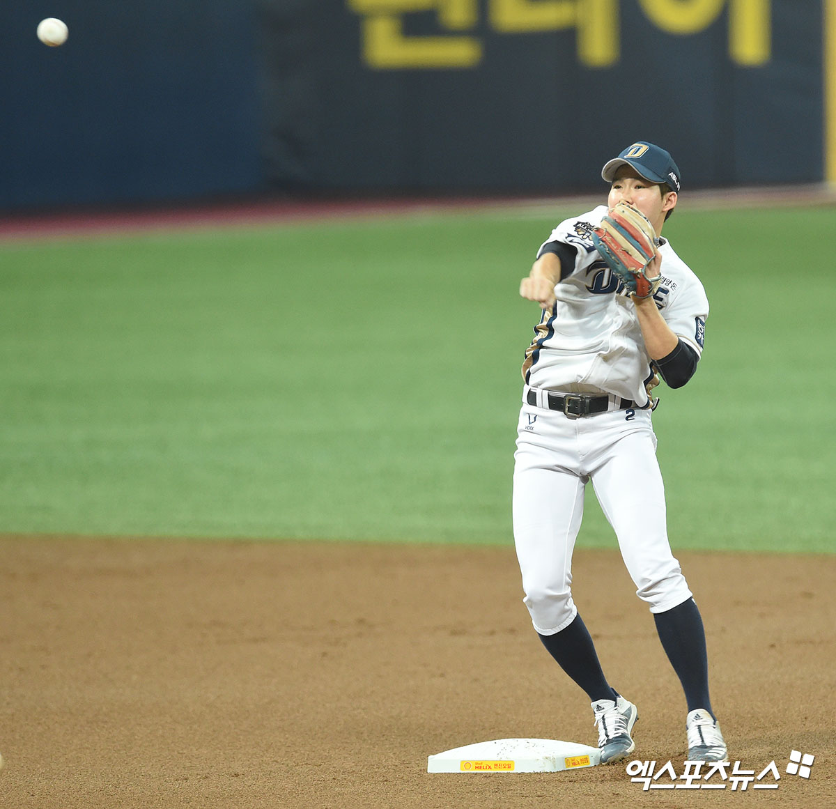 [엑스포츠뉴스 고척, 김한준 기자] 23일 오후 서울 구로구 고척스카이돔에서 열린 ‘2020 신한은행 SOL 포스트시즌’ 두산 베어스와 NC 다이노스의 한국시리즈 5차전 경기, 1회초 무사 1루 NC 박민우가 두산 정수빈의 내야땅볼때 허경민을 포스아웃 시킨 후 1루로 송구하고 있다.