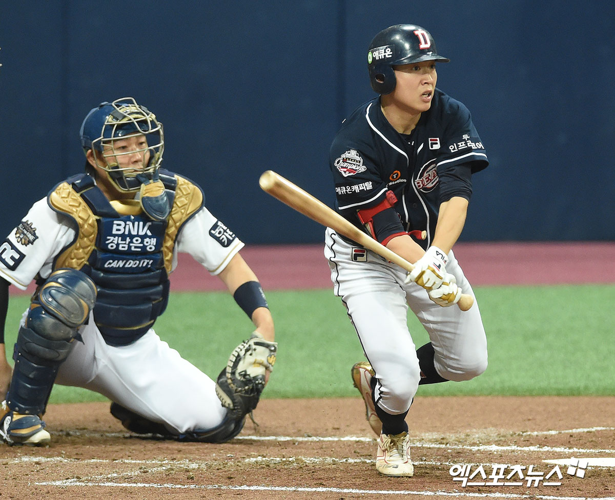[엑스포츠뉴스 고척, 김한준 기자] 23일 오후 서울 구로구 고척스카이돔에서 열린 ‘2020 신한은행 SOL 포스트시즌’ 두산 베어스와 NC 다이노스의 한국시리즈 5차전 경기, 3회초 2사 두산 정수빈이 우전안타를 날리고 있다.