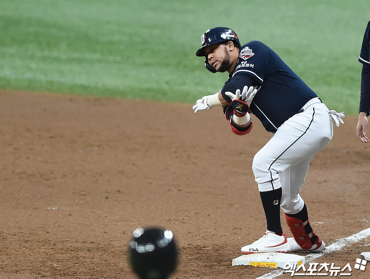 [엑스포츠뉴스 고척, 박지영 기자] 23일 오후 서울 구로구 고척스카이돔에서 열린 '2020 신한은행 SOL KBO 포스트시즌' 두산 베어스와 NC 다이노스의 한국시리즈 5차전 경기, 3회초 2사 1루 두산 페르난데스가 안타를 때려낸 뒤 세리머니를 하고 있다.