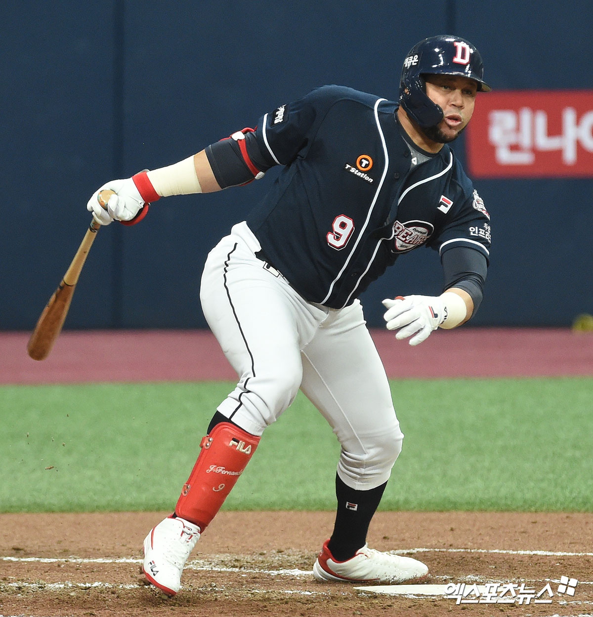 [엑스포츠뉴스 고척, 김한준 기자] 23일 오후 서울 구로구 고척스카이돔에서 열린 ‘2020 신한은행 SOL 포스트시즌’ 두산 베어스와 NC 다이노스의 한국시리즈 5차전 경기, 3회초 2사 1루 두산 페르난데스가 내야안타를 날리고 있다.