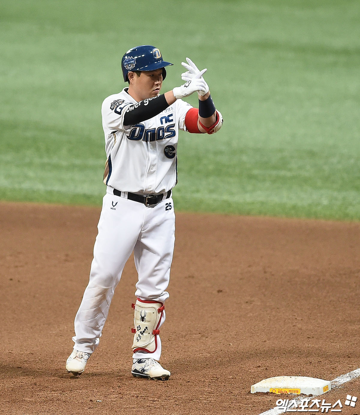 [엑스포츠뉴스 고척, 박지영 기자] 23일 오후 서울 구로구 고척스카이돔에서 열린 '2020 신한은행 SOL KBO 포스트시즌' 두산 베어스와 NC 다이노스의 한국시리즈 5차전 경기, 4회말 2사 1루 NC 양의지가 안타를 때려낸 뒤 세리머니를 하고 있다.