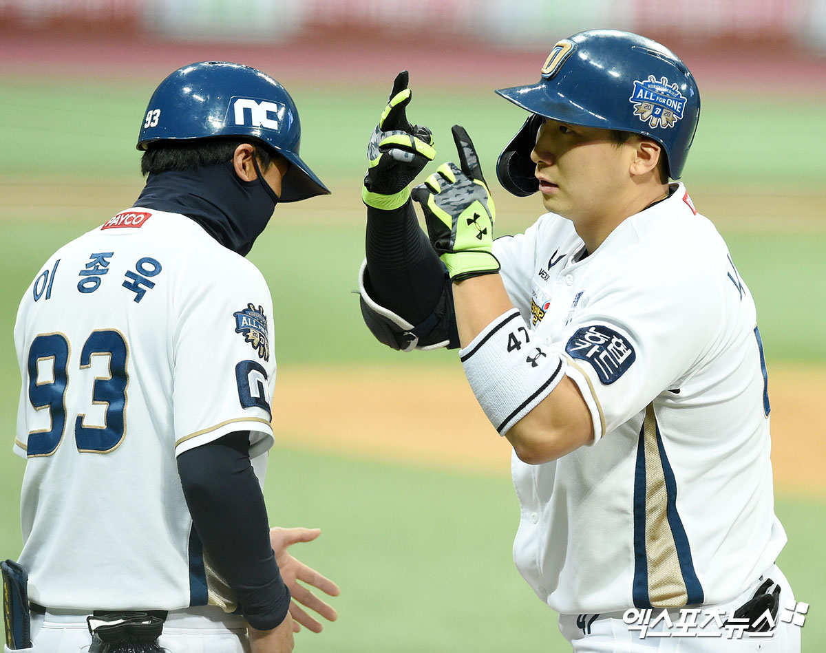 [엑스포츠뉴스 고척, 김한준 기자] 23일 오후 서울 구로구 고척스카이돔에서 열린 ‘2020 신한은행 SOL 포스트시즌’ 두산 베어스와 NC 다이노스의 한국시리즈 5차전 경기, 4회말 2사 NC 나성범이 좌전안타를 날린 후 세리머니를 하고 있다.
