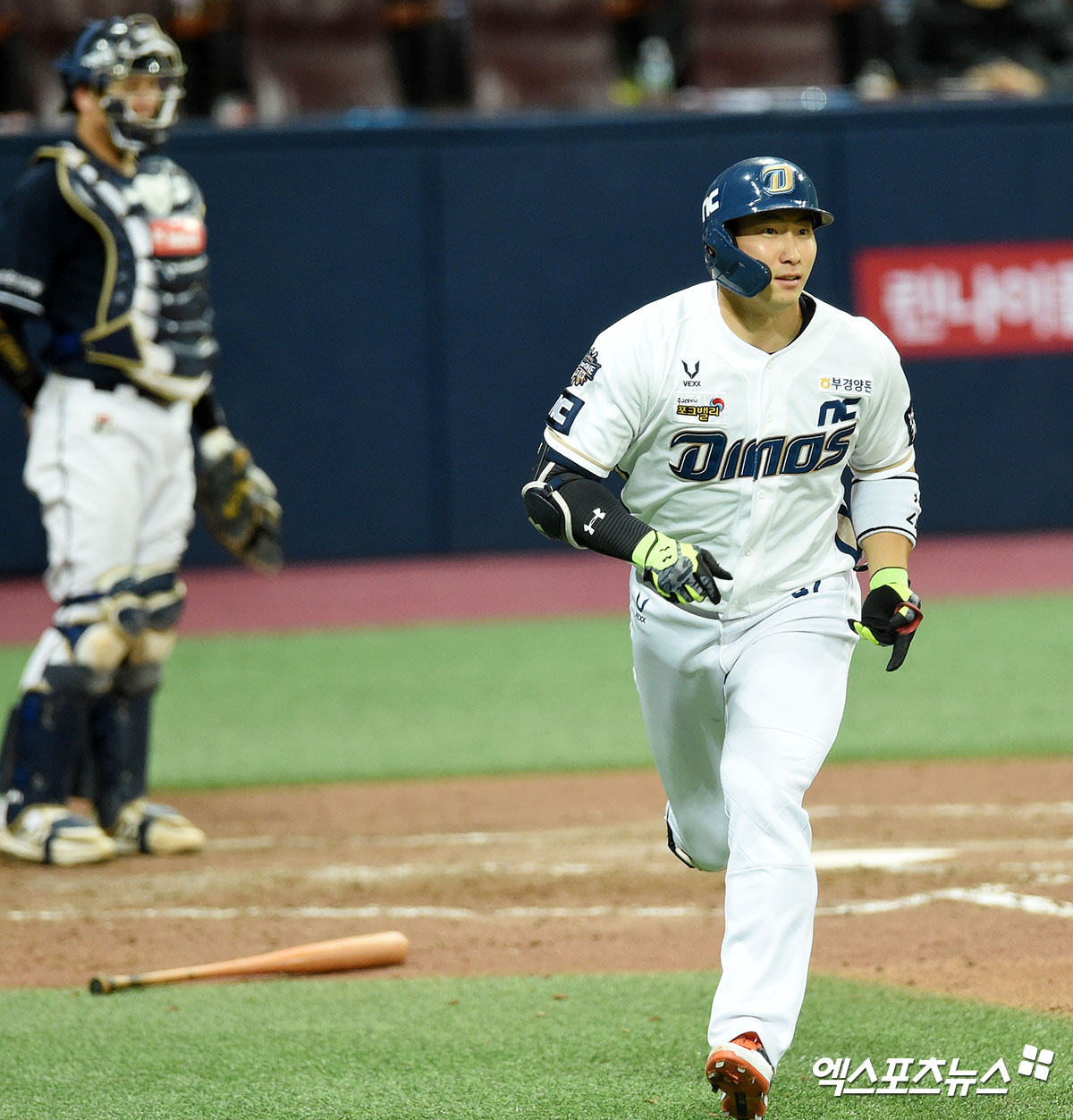 [엑스포츠뉴스 고척, 김한준 기자] 23일 오후 서울 구로구 고척스카이돔에서 열린 ‘2020 신한은행 SOL 포스트시즌’ 두산 베어스와 NC 다이노스의 한국시리즈 5차전 경기, 6회말 1사 NC 나성범이 우전안타를 날리고 있다.