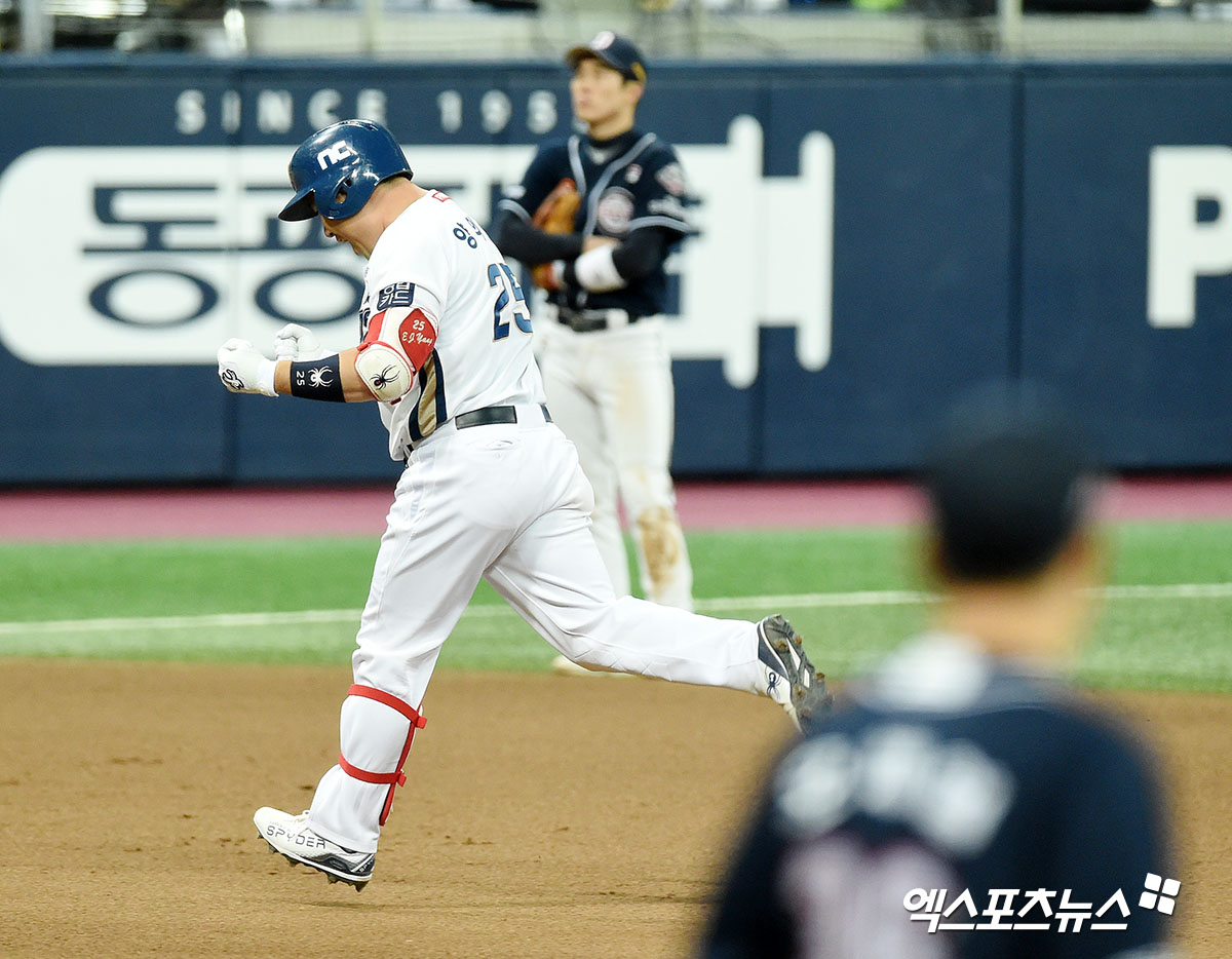 [엑스포츠뉴스 고척, 김한준 기자] 23일 오후 서울 구로구 고척스카이돔에서 열린 ‘2020 신한은행 SOL 포스트시즌’ 두산 베어스와 NC 다이노스의 한국시리즈 5차전 경기, 6회말 1사 1루 NC 양의지가 투런 홈런을 날린 후 그라운드를 돌고 있다.