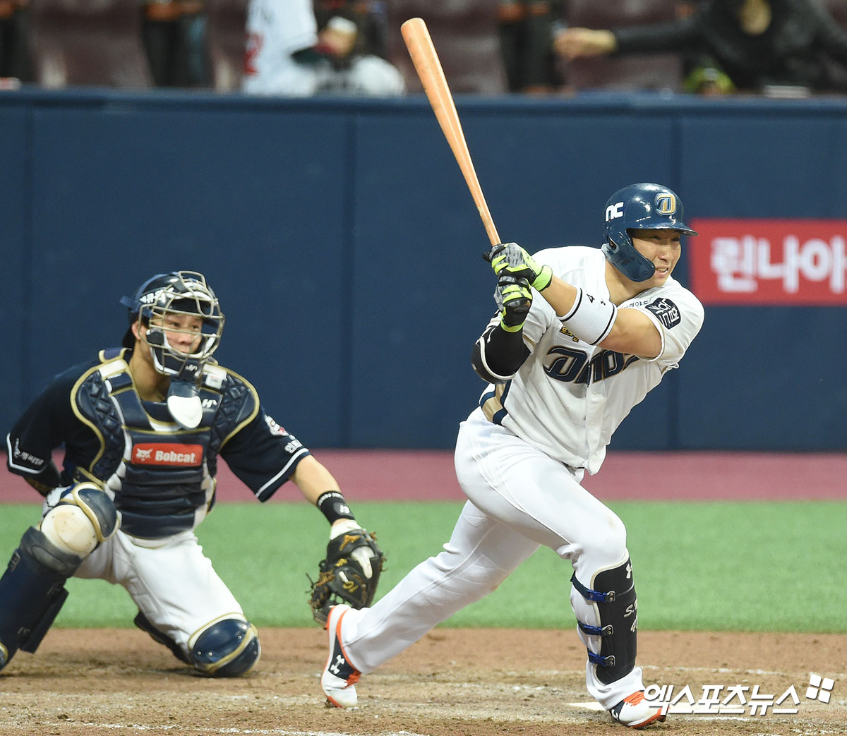 [엑스포츠뉴스 고척, 김한준 기자] 23일 오후 서울 구로구 고척스카이돔에서 열린 ‘2020 신한은행 SOL 포스트시즌’ 두산 베어스와 NC 다이노스의 한국시리즈 5차전 경기, 7회말 2사 1,2루 NC 나성범이 1타점 적시타를 날리고 있다.