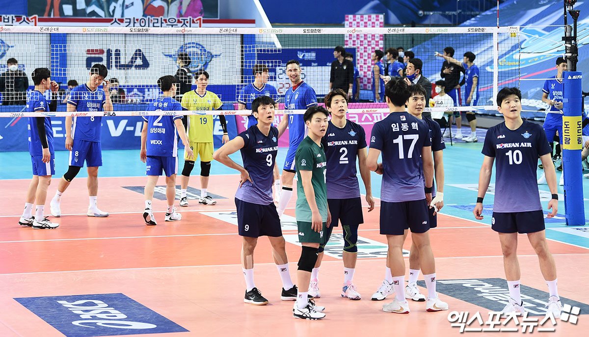 대한항공 측에서 삼성화재 블로커 터치 아웃에 관한 비디오 판독을 요청한 뒤 양 팀 선수들이 전광판을 바라보고 있다.