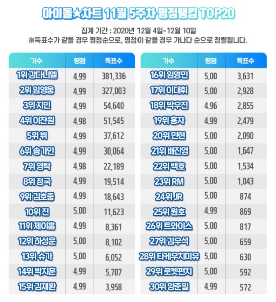 가수 강다니엘이 12월 1주차(20.12.04~12.10) 아이돌차트 평점랭킹에서 최다득표를 기록했다.