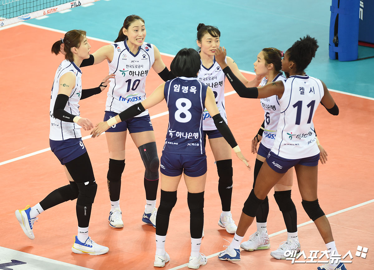 [엑스포츠뉴스 인천, 김한준 기자] 13일 오후 인천 계양체육관에서 열린 ‘2020-2021 도드람 V리그’ 흥국생명과 한국도로공사의 경기, 도로공사 선수들이 득점 후 기뻐하고 있다.