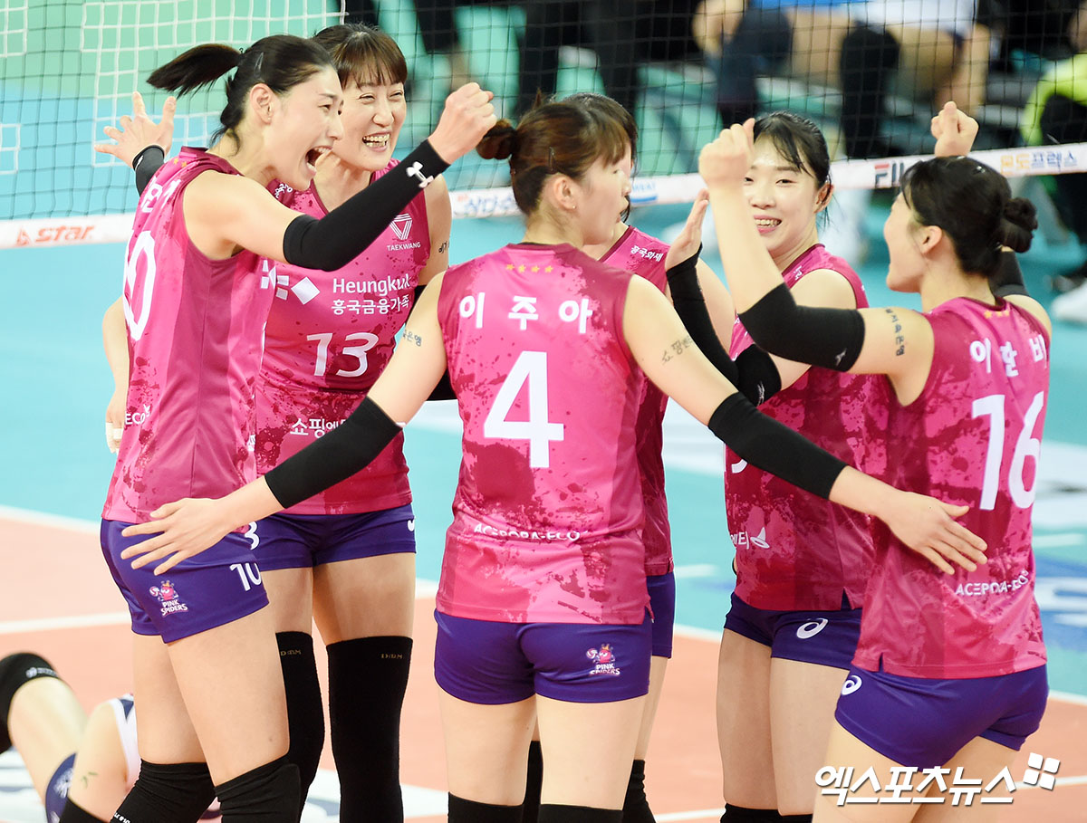 [엑스포츠뉴스 인천, 김한준 기자] 13일 오후 인천 계양체육관에서 열린 ‘2020-2021 도드람 V리그’ 흥국생명과 한국도로공사의 경기, 흥국생명 선수들이 득점 후 기뻐하고 있다.