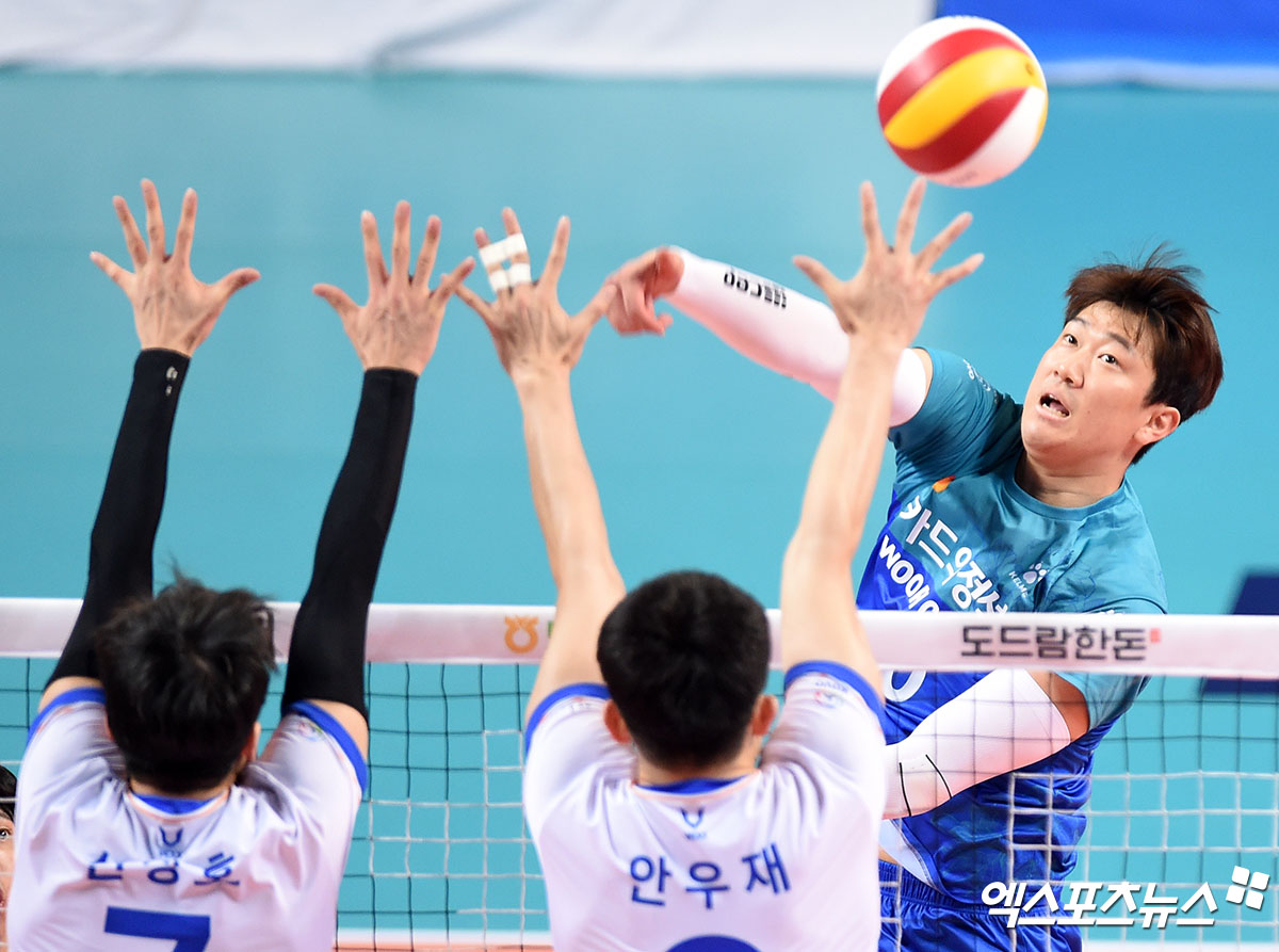 [엑스포츠뉴스 장충, 김한준 기자] 20일 오후 서울 중구 장충체육관에서 열린 ‘2020-2021 도드람 V리그’ 우리카드와 삼성화재의 경기, 우리카드 나경복이 공격을 시도하고 있다.