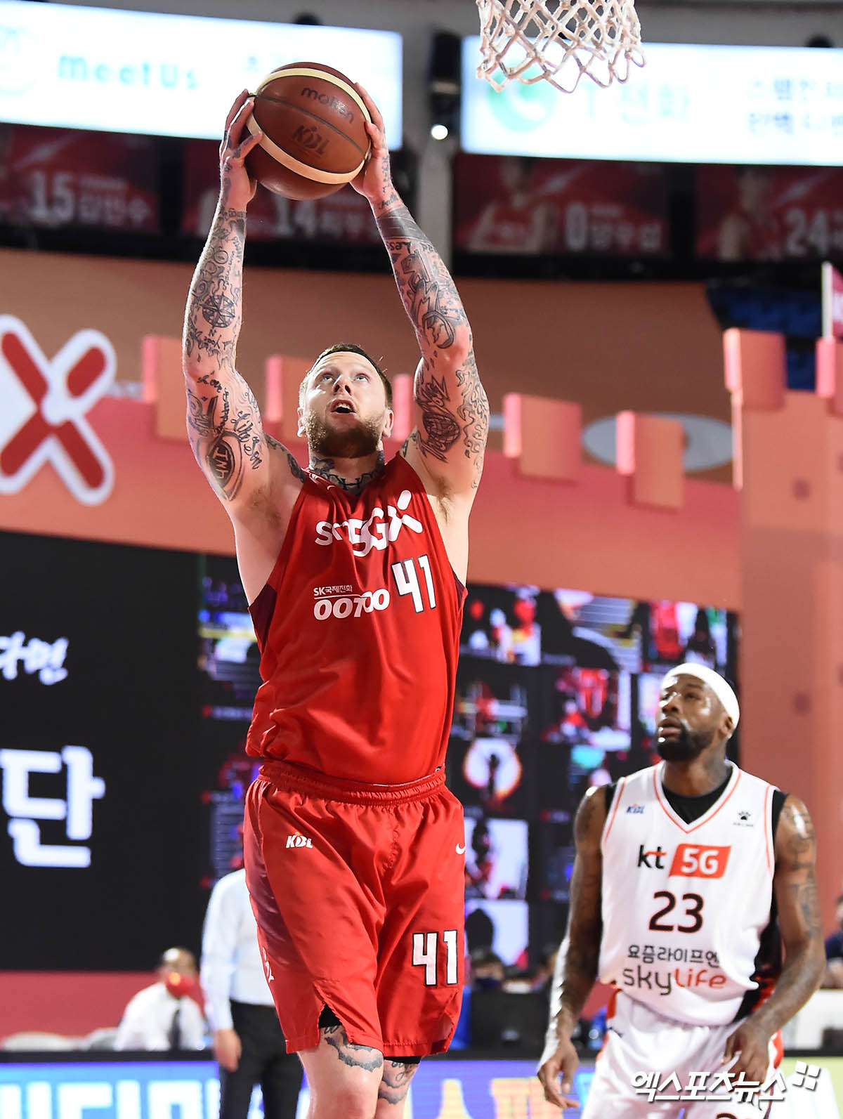 [엑스포츠뉴스 잠실학생체, 윤다희 기자] 27일 오후 서울 송파구 잠실학생체육관에서 열린 ‘2020-2021 현대모비스 프로농구’ 서울 SK와 부산 KT의 경기, SK 미네라스가 리바운드를 성공하고 있다.