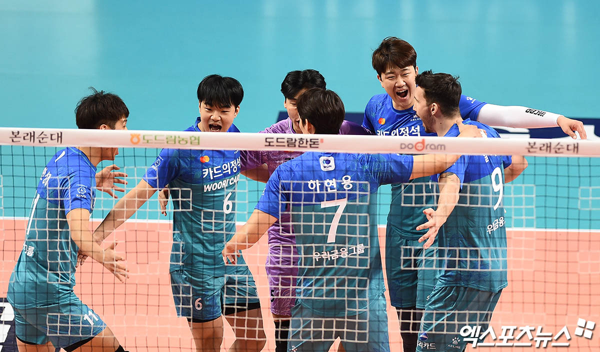 [엑스포츠뉴스 장충, 박지영 기자] 7일 오후 서울 장충체육관에서 열린 '도드람 2020-2021 V리그' 남자부 우리카드와 OK금융그룹의 경기, 우리카드 선수들이 득점 후 환호하고 있다.