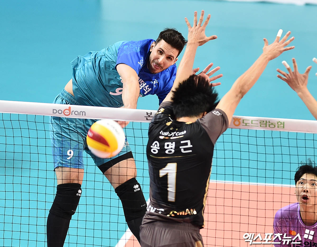 [엑스포츠뉴스 장충, 박지영 기자] 7일 오후 서울 장충체육관에서 열린 '도드람 2020-2021 V리그' 남자부 우리카드와 OK금융그룹의 경기, 우리카드 알렉스가 공격을 시도하고 있다.