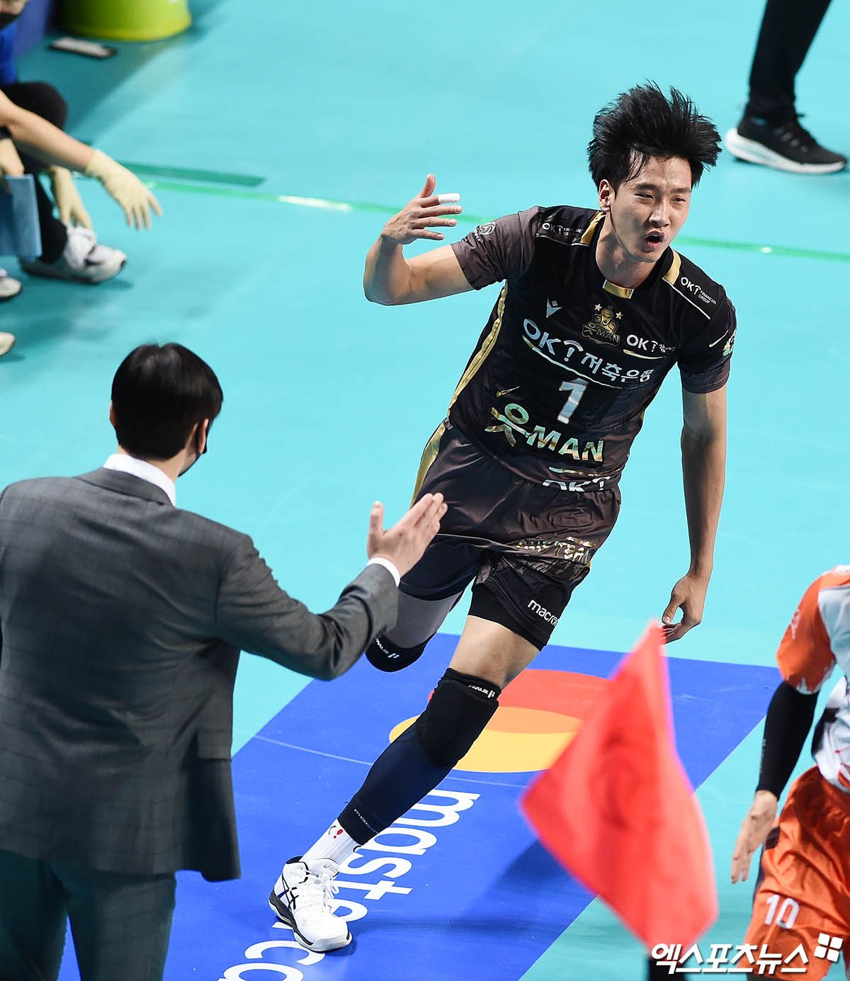 [엑스포츠뉴스 장충, 박지영 기자] 7일 오후 서울 장충체육관에서 열린 '도드람 2020-2021 V리그' 남자부 우리카드와 OK금융그룹의 경기, OK금융그룹 송명근이 득점 후 환호하고 있다.